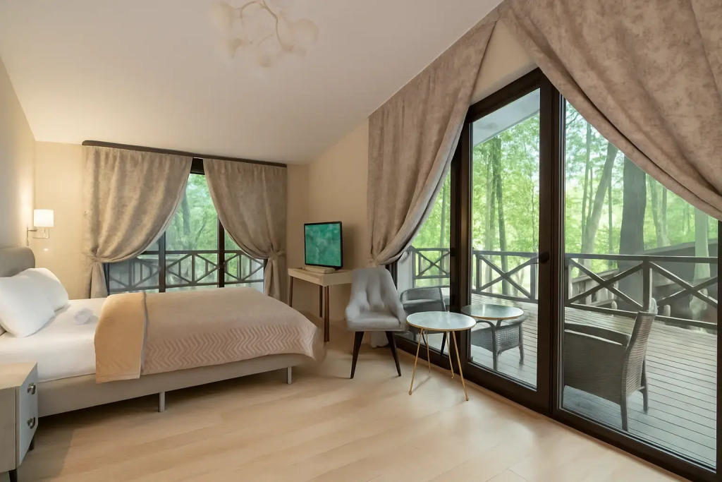 Территория отеля расположена в сосновом лесу, где можно гулять и собирать грибы.