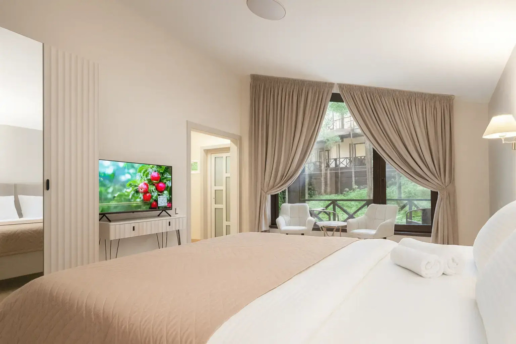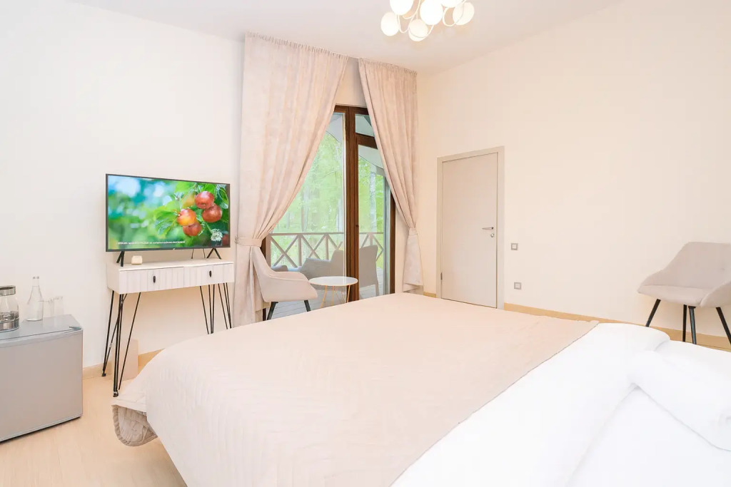 Также к услугам гостей водные развлечения, такие как сапборды и катамараны, спортивные площадки, детская инфраструктура и зоны отдыха с видом на природу.