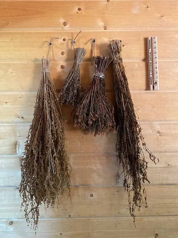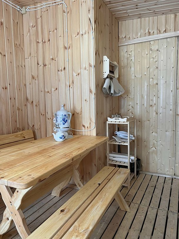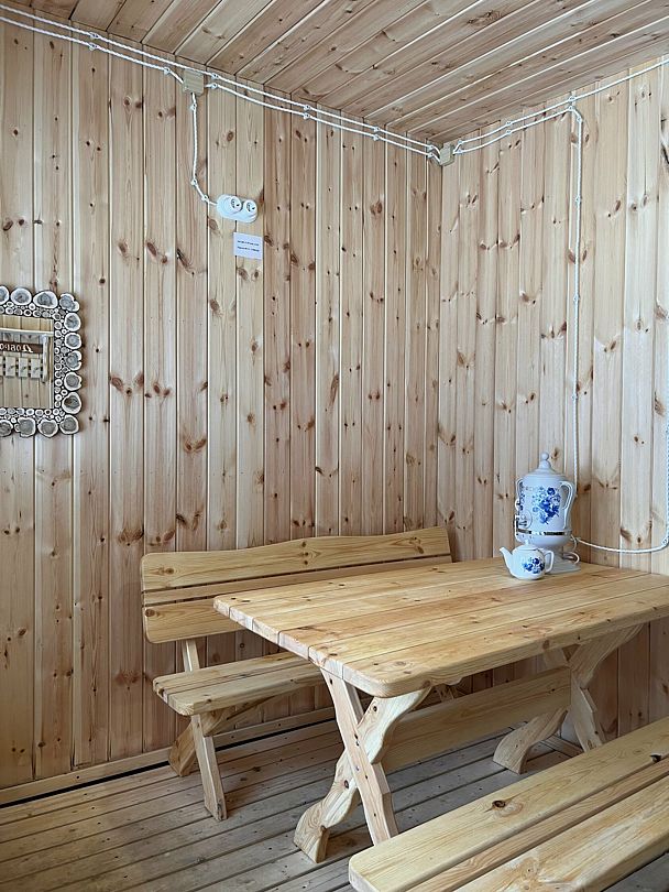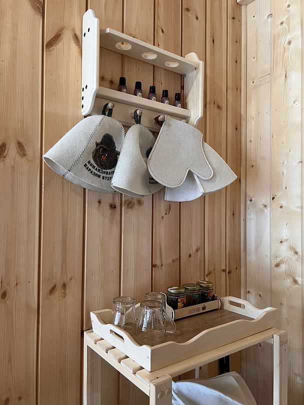 Веник, шапочки и простыни входят в стоимость. Также в баньке есть арома-масла для парения и чай.