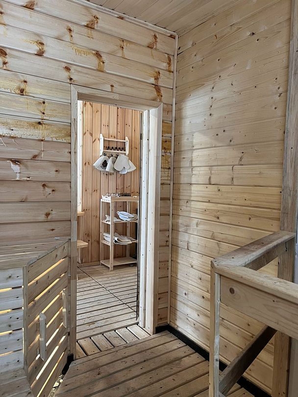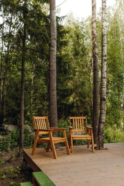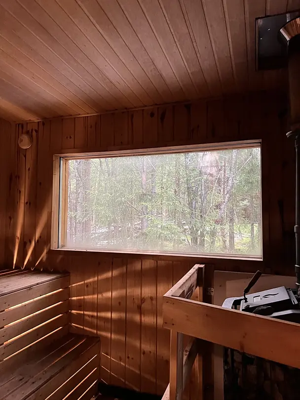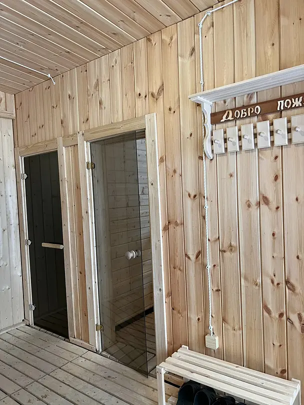 Включает парилку, комнату отдыха, санузел, душевую и террасу, выходящую на лес.