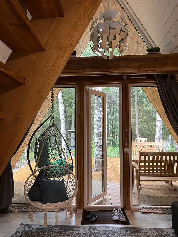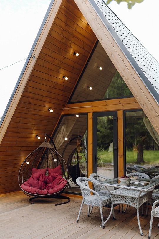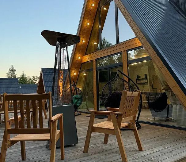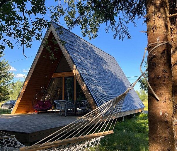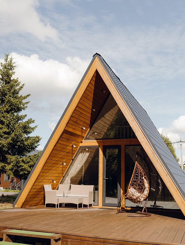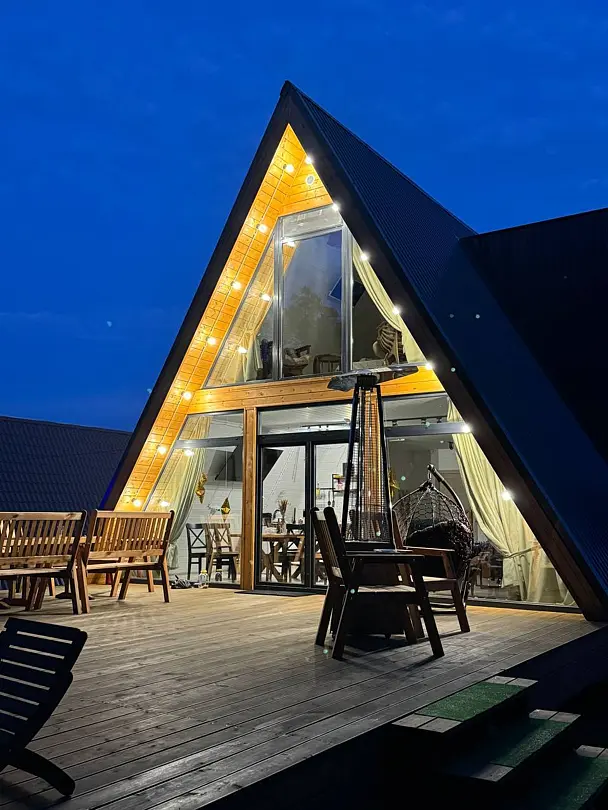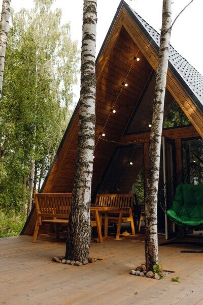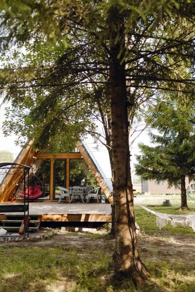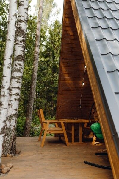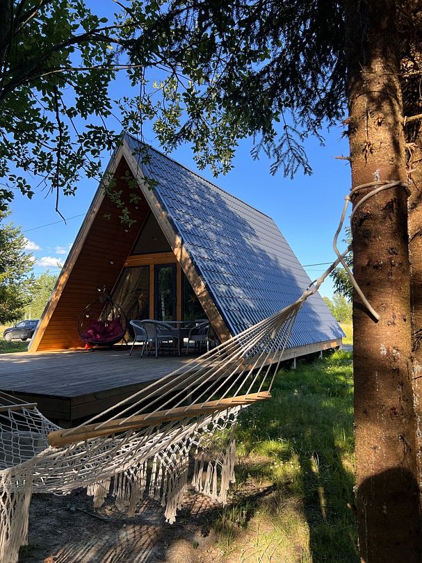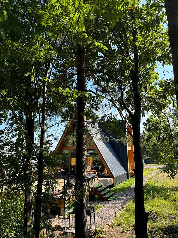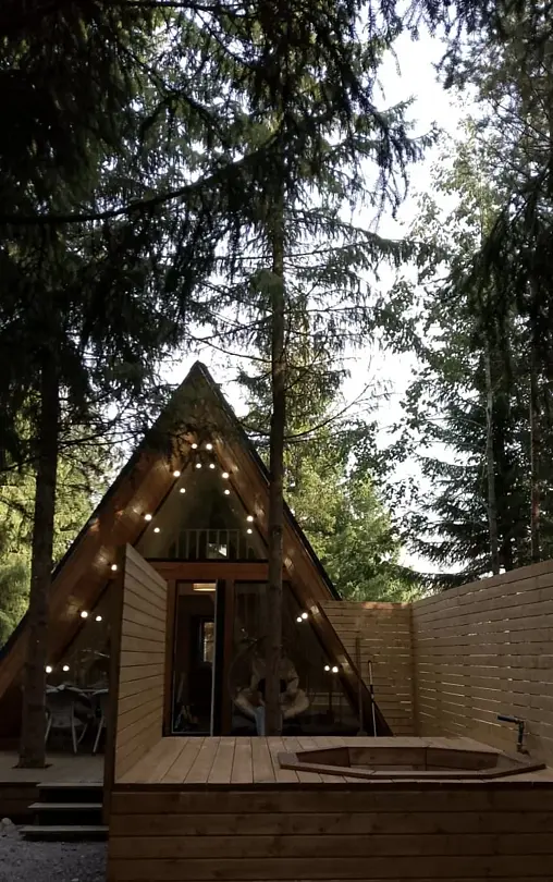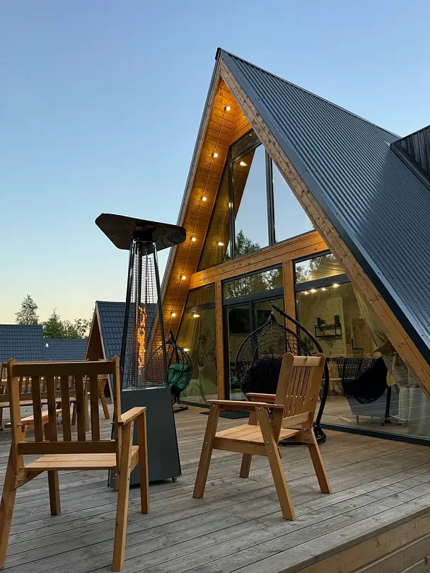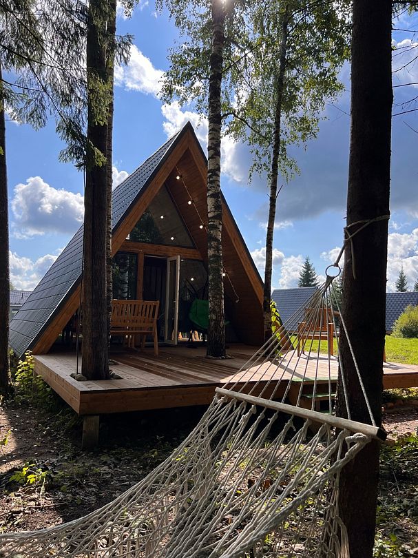 Для проживания гостей предлагается несколько вариантов домиков типа A-frame, каждый из которых имеет свою террасу с мангалом и зоной отдыха. Панорамные окна домов выходят на лес. В каждом доме, расположенном около леса, есть всё необходимое для комфортного отдыха.