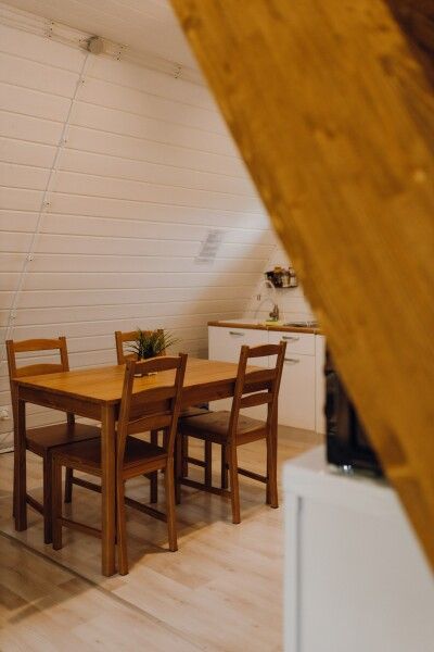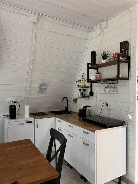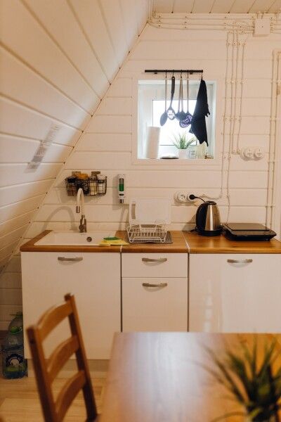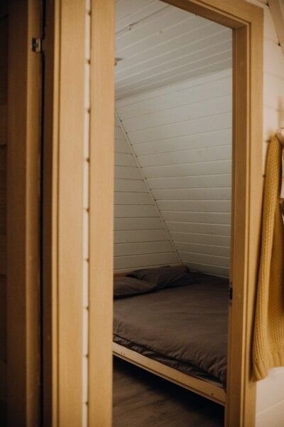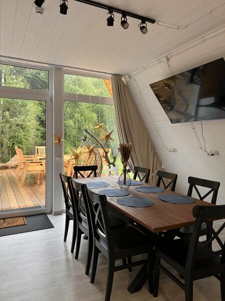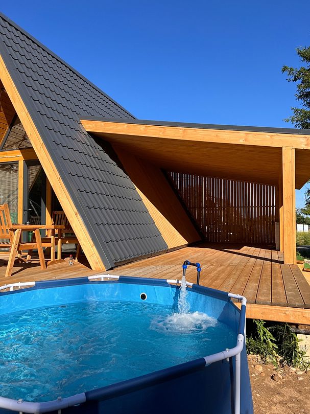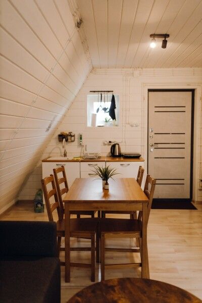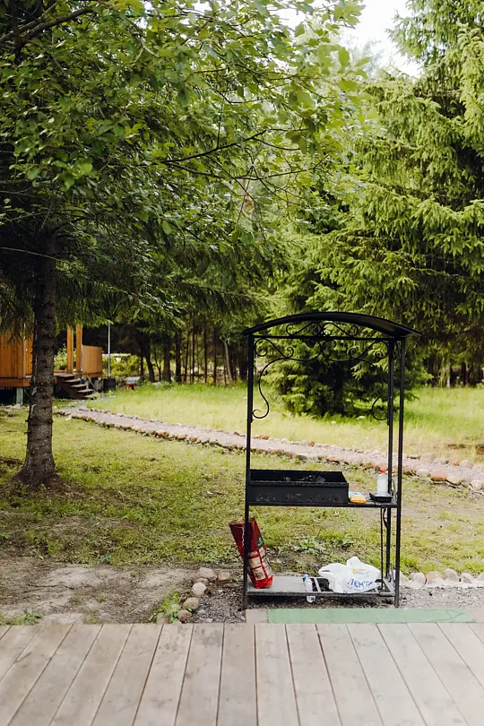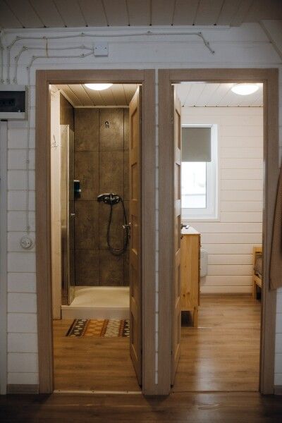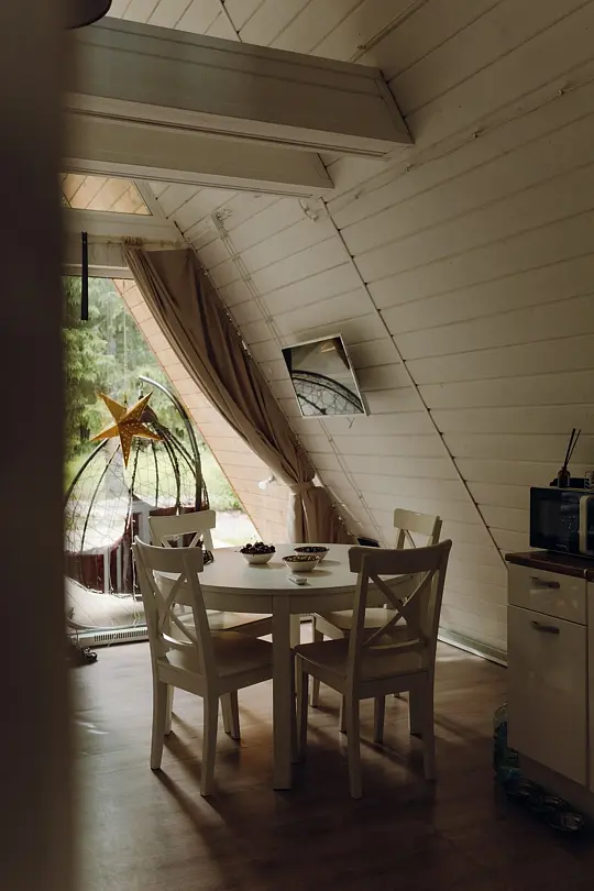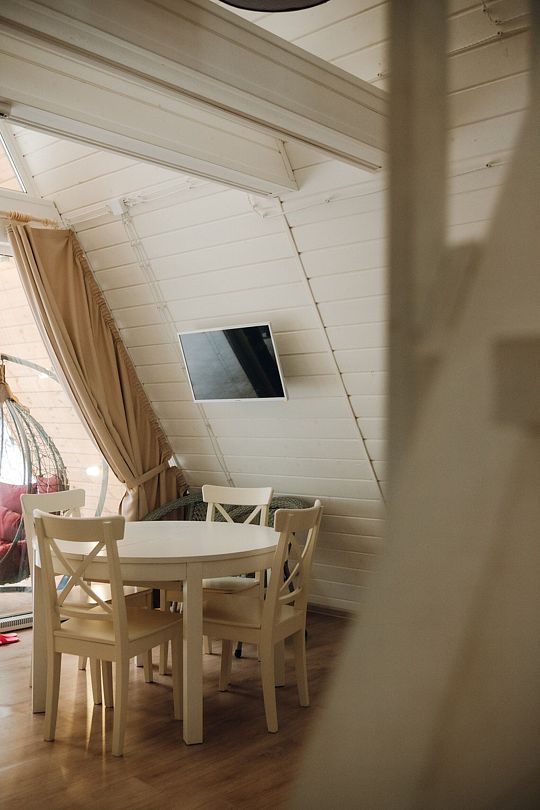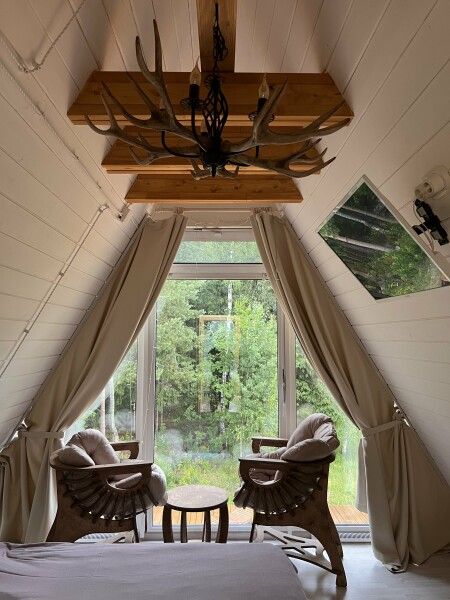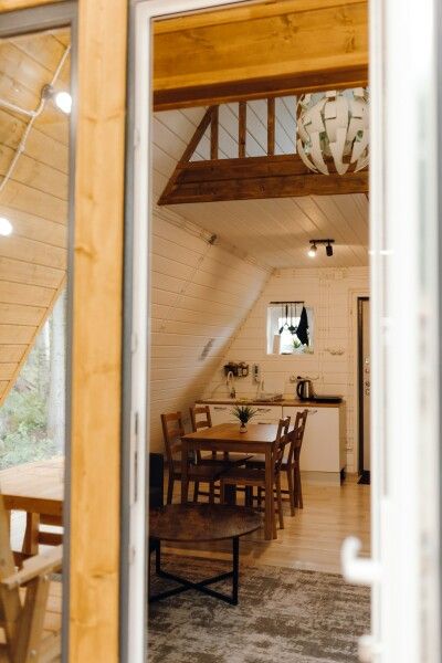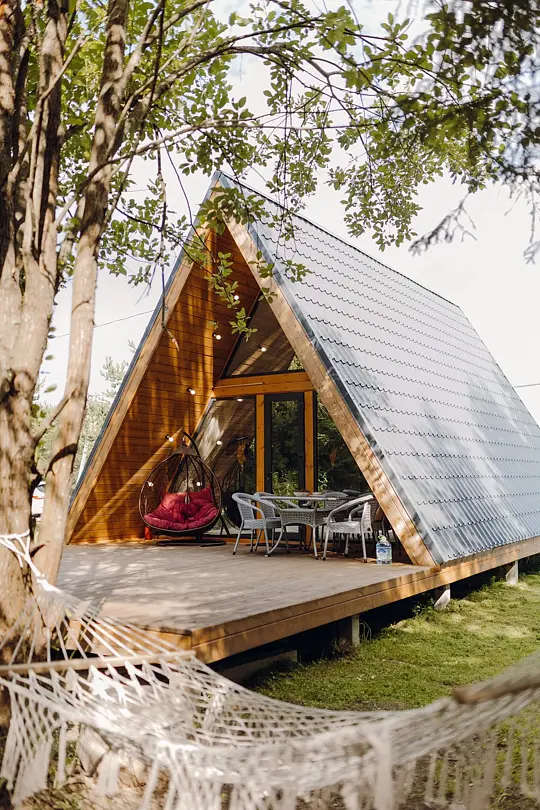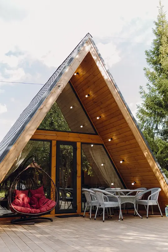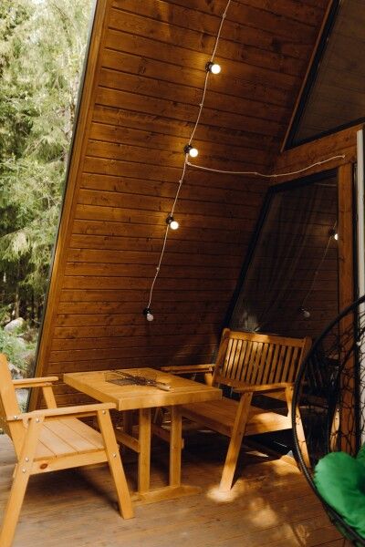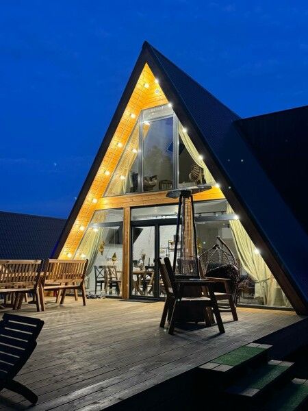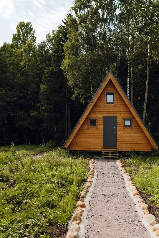 Для проживания гостей предлагается несколько вариантов домиков типа A-frame, каждый из которых имеет свою террасу с мангалом и зоной отдыха. Панорамные окна домов выходят на лес. В каждом доме, расположенном около леса, есть всё необходимое для комфортного отдыха.