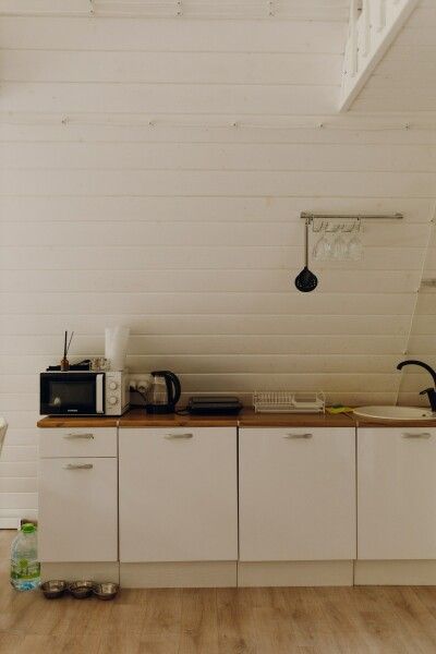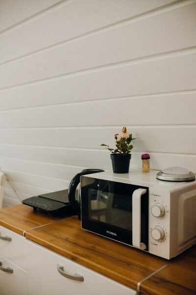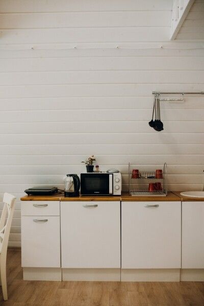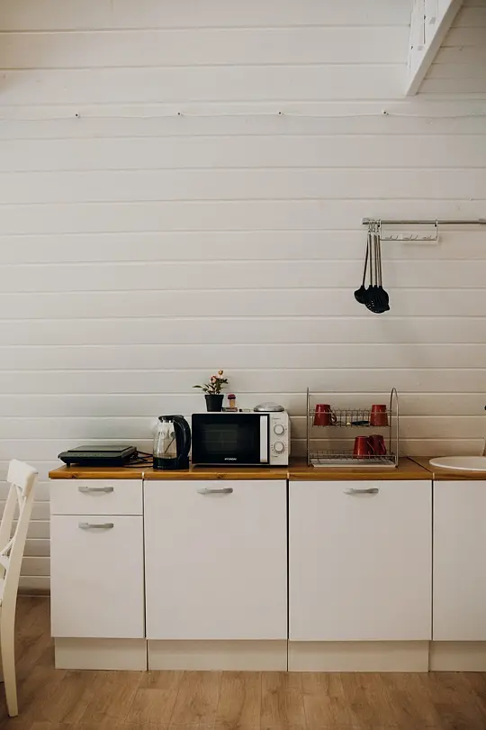 - мини-кухня со всем необходимым (микроволновка, холодильник, варочная панель, посуда, чайник);