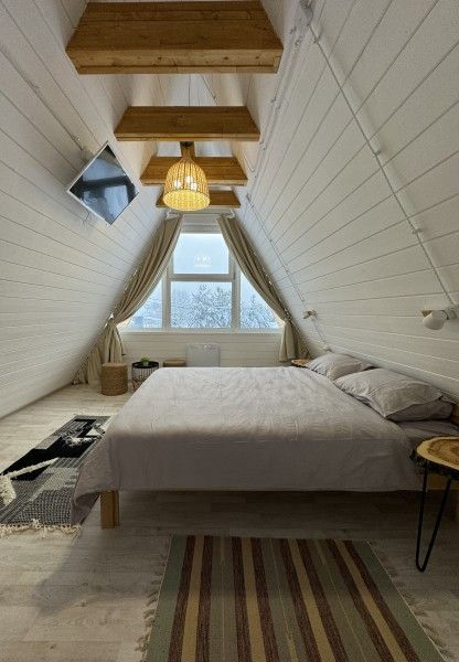 спальня с двуспальной кроватью, двуспальный диван и двуспальный матрац под крышей, с/у, душ, мини-кухня, уличная купель