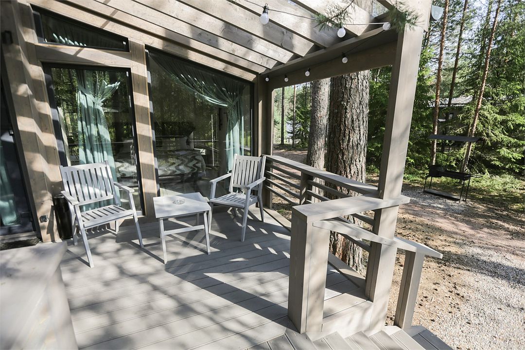 Через панорамные окна открывается потрясающий вид на лес Карельского перешейка. Дом рассчитан на 4 (+2) человек, две спальни и большая кухня-гостиная.