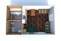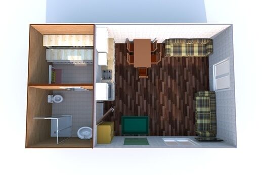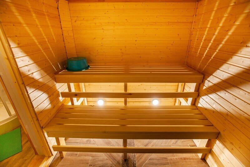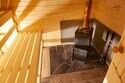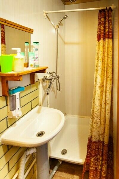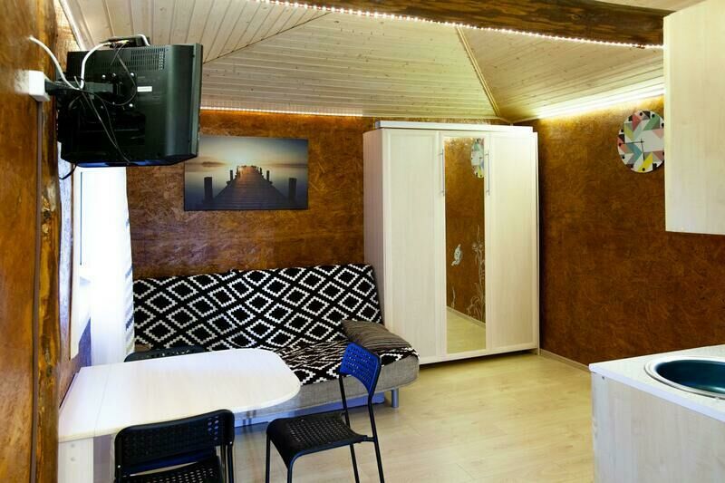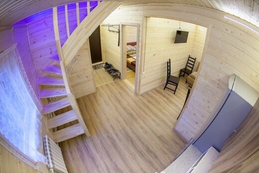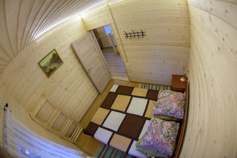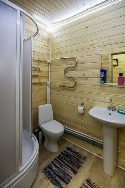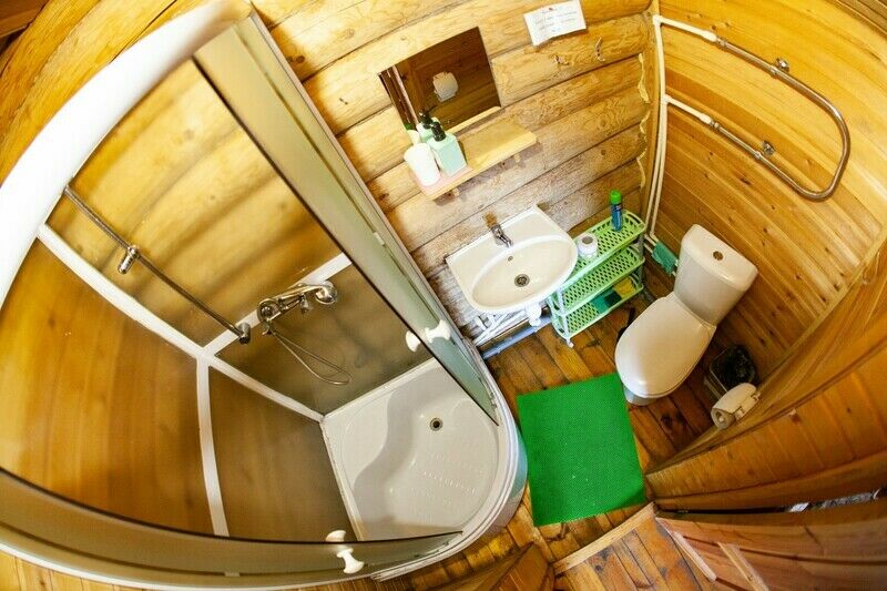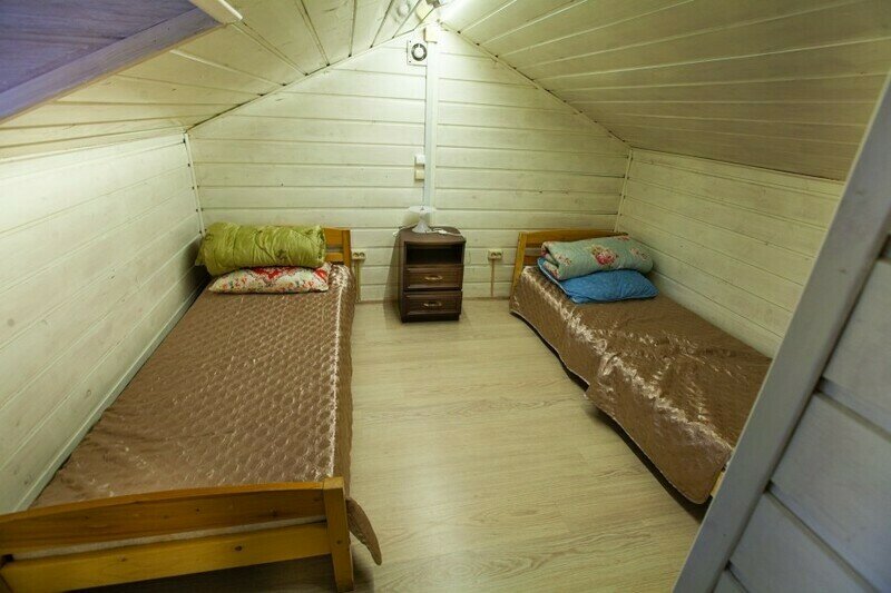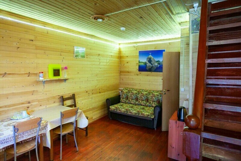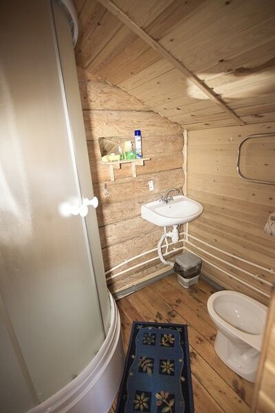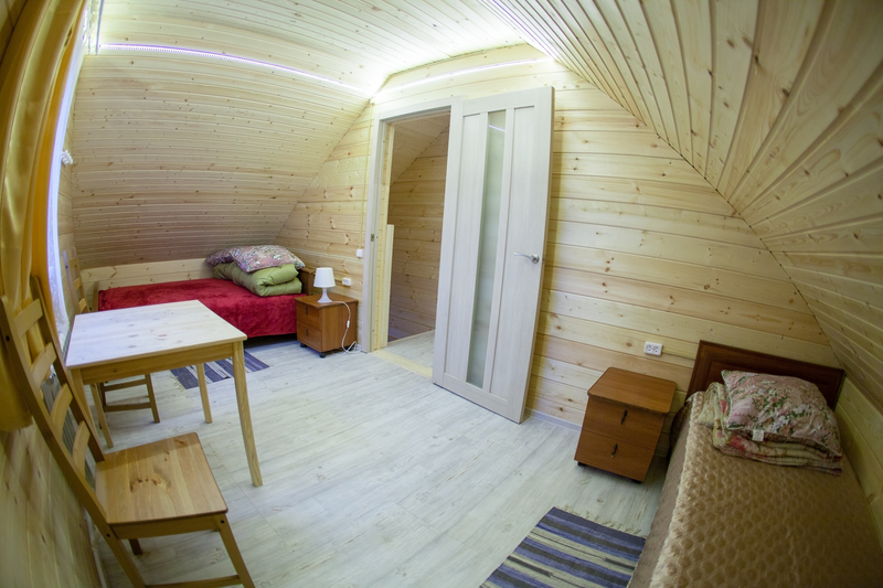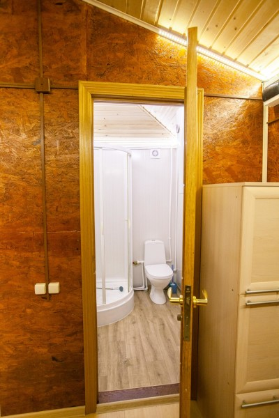 В комнате на первом этаже размещен диван, на втором – две односпальные кровати. Туалетная комната оснащена душем, раковиной, унитазом. В номере есть горячая и холодная вода, отопление.