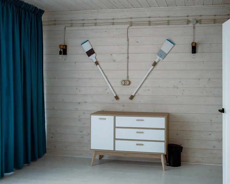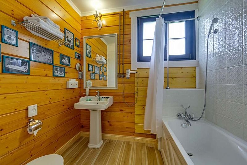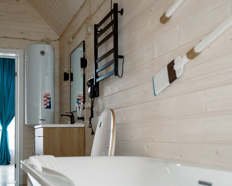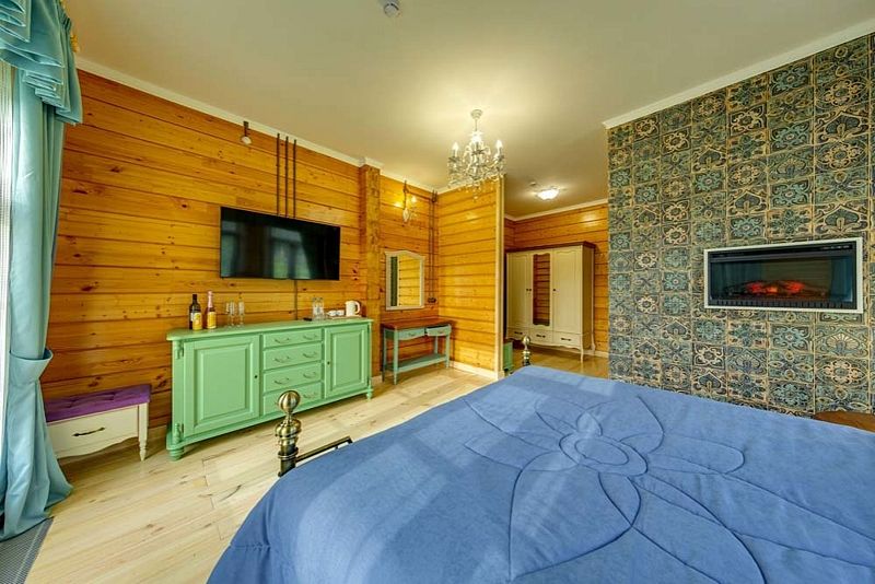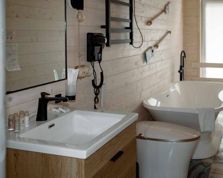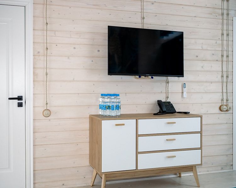 Номер оснащен двумя кроватями, совмещенными в одну большую кровать с удобным ортопедическим матрасом. Из больших панорамных окон открывается прекрасный вид на реку или на живописную территорию отеля.