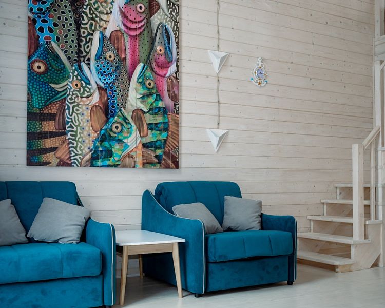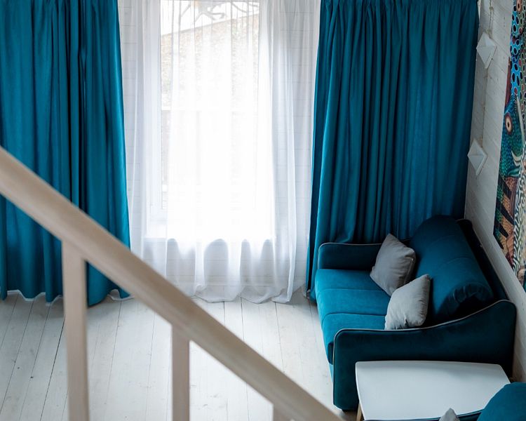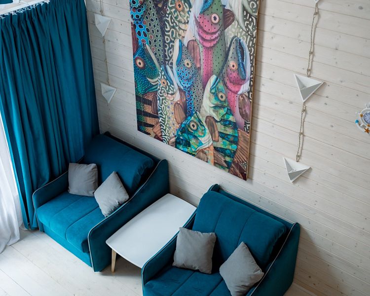 Первый этаж – просторная меблированная гостиная, идеально подходящий для различного вида мероприятий: от тематических вечеринок и банкетов. Оснащена кухней с холодильником и микроволновой печью, и зоной отдыха с плазменной панелью. На первом этаже расположены 6 номеров категории делюкс.