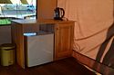 Бунгало состоит из двух комнат; в одной из них установлена двуспальная кровать, в другой - гостиная с обеденным столом. В номере располагается отдельный санузел с умывальником и зеркалом, 2 полотенца для рук. Бунгало отапливается электрическими обогревателями; в наличии имеется электрический чайник, микроволновая печь, мини-холодильник, кондиционер.