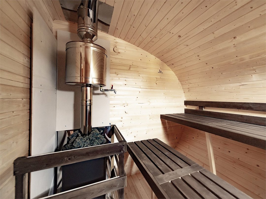 Между Бунгало и Баней установлена купель, которая отапливается с помощью дровяной печи, а также 2 шезлонга.