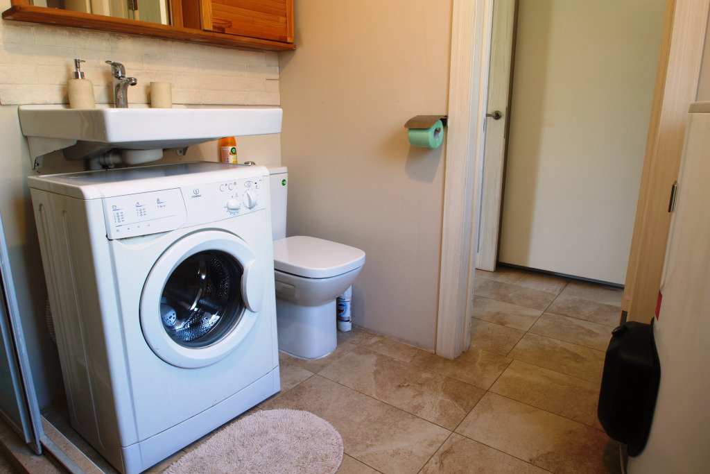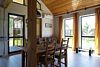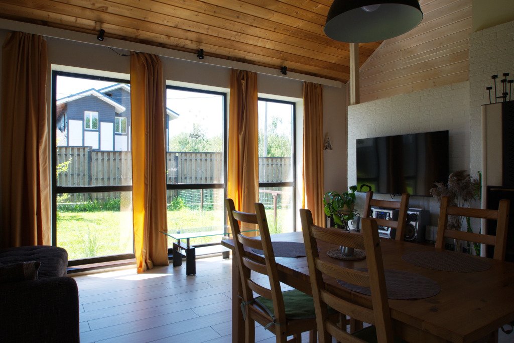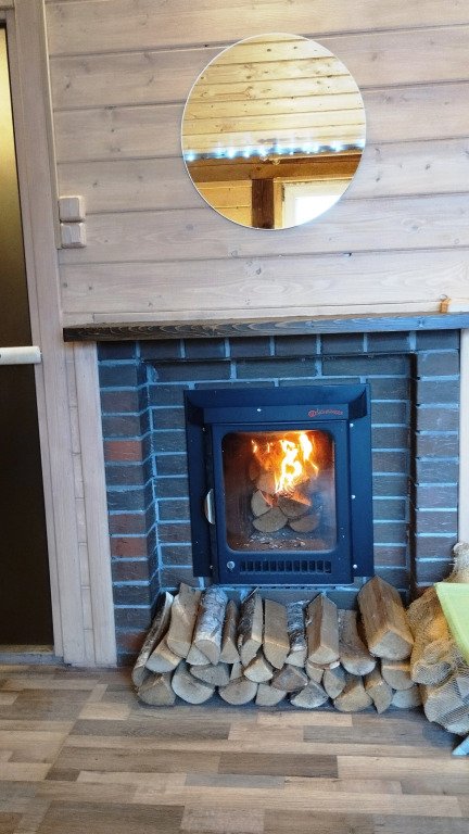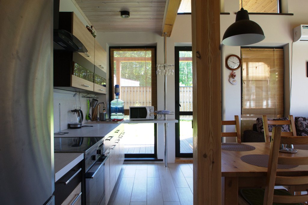 На первом этаже есть гостиная с кухней, санузел и маленькая баня. В гостиной располагается раскладной стол, раскладной диван, телевизор — смарт, музыкальный центр, кондиционер, дровяной камин, беспроводной интернет. Кухня наполнена необходимым: посуда для приготовления и сервировки, холодильник, варочная плита с духовкой, микроволновая печь, бутыль 20 л с питьевой водой.