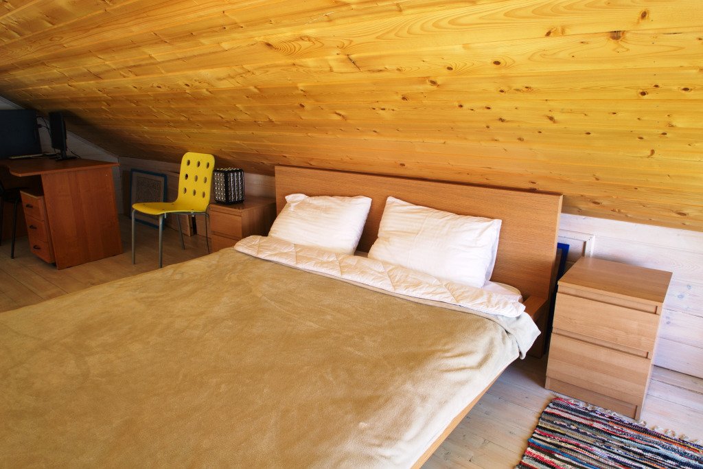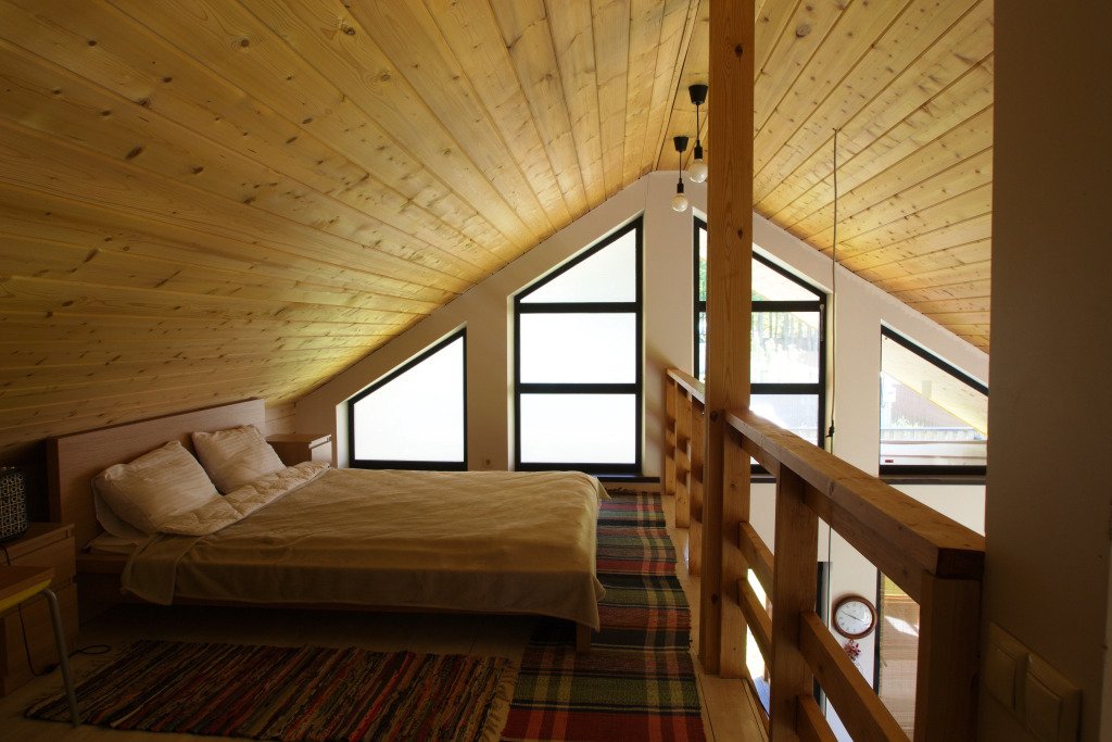 На втором этаже размещается изолированная спальня с двумя двуспальными кроватями, а также двуспальная кровать в открытой зоне.
