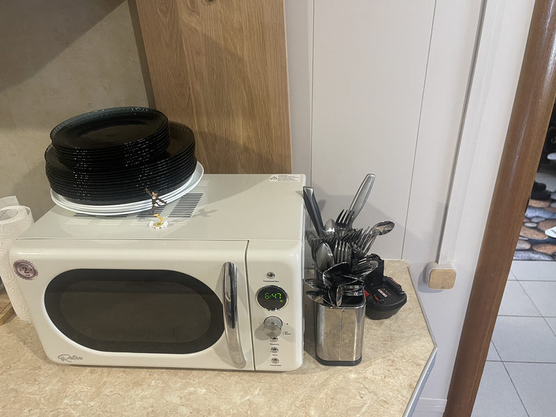 Кухня оборудована бытовой техникой: установлен холодильник, есть плита с духовкой, а также СВЧ-печь и чайник.