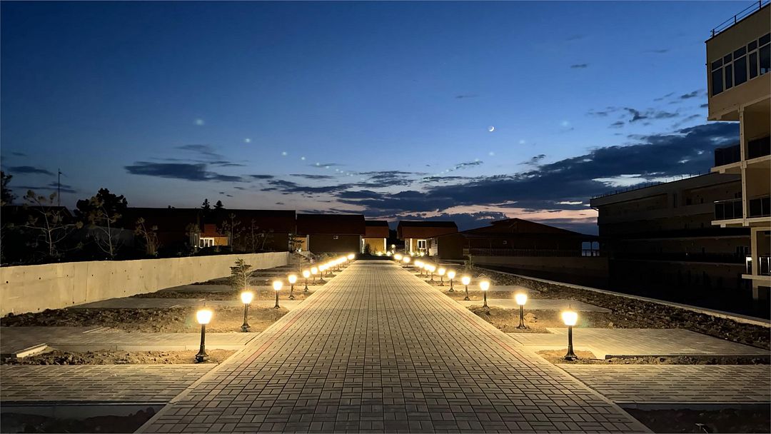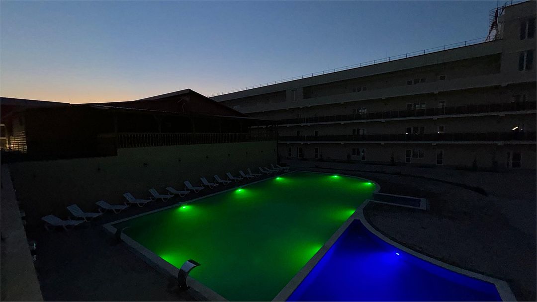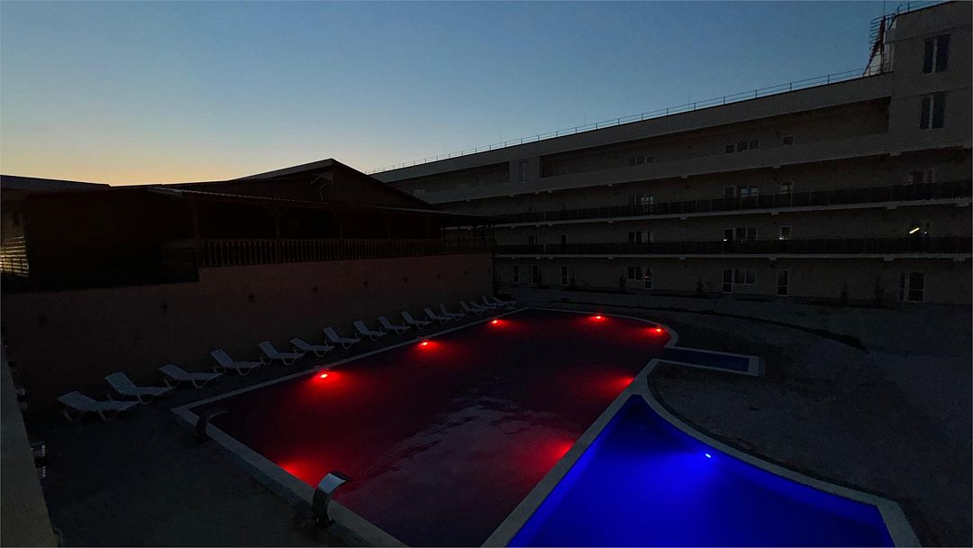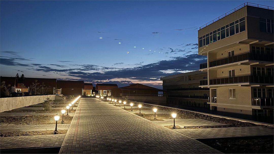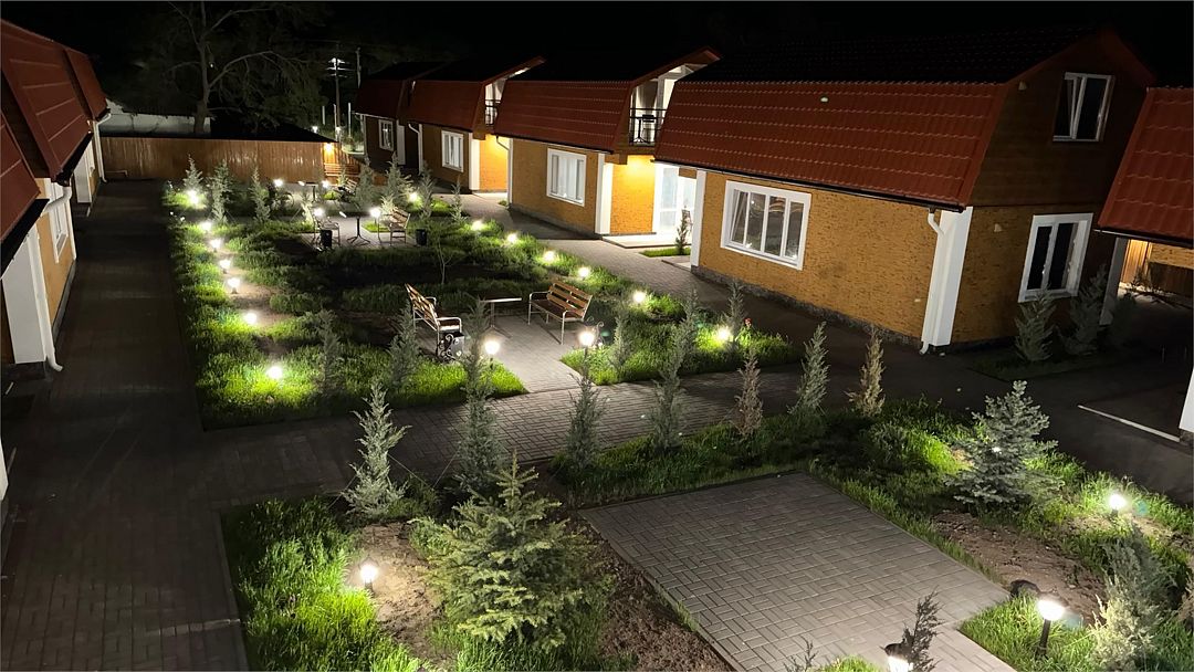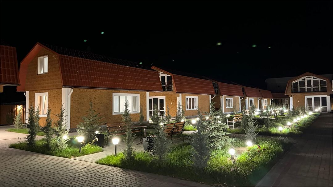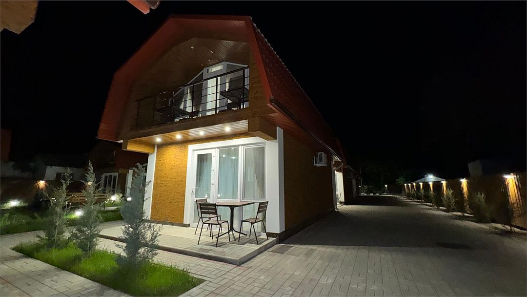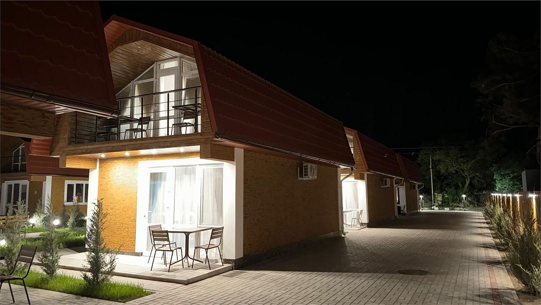 Комплекс занимает благоустроенную территорию площадью чуть меньше одного гектара, на которой высажены оранжерейные кустовые розы и парковая хвойная аллея. Спальный трехэтажный корпус включает в себя 40 комфортабельных номеров Double и Twin. В номерах светлые интерьеры, выдержанные в кремовых оттенках, везде предусмотрен индивидуальный санузел, установлен кондиционер, есть электрочайник, плазменный телевизор, набор посуды.