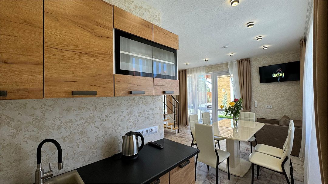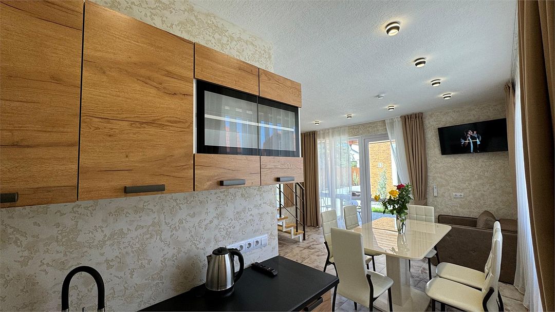 кондиционер, фен, утюг, санузел, халаты, банные полотенца, пляжные полотенца, тапочки, диван, стулья, шкаф для одежды, зеркало, унитаз, раковина, душ, две кровати «King size», стол, диван-кровать, мини-холодильник, телевизор со Smart TV, два раскладных кресла, вешалки-плечики, шапочка для душа, мыло, можно с питомцамиВ коттедже
