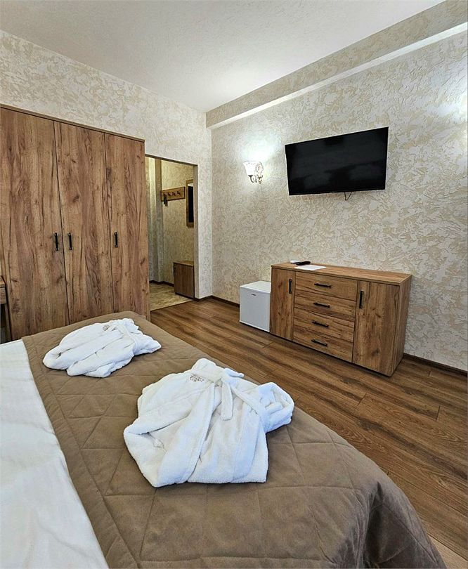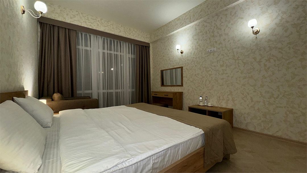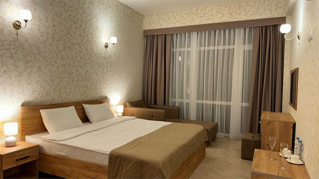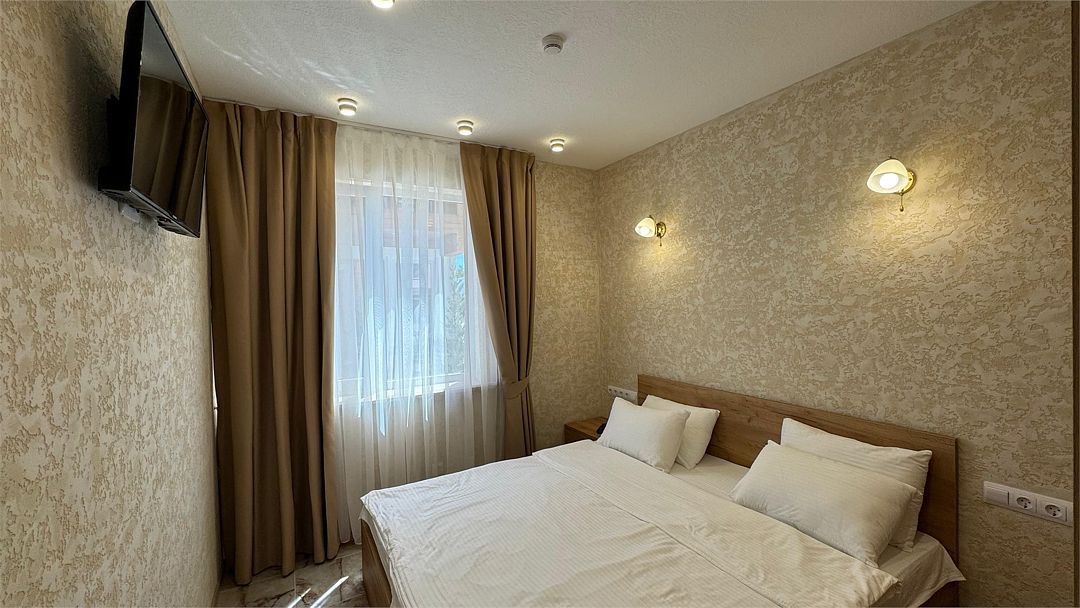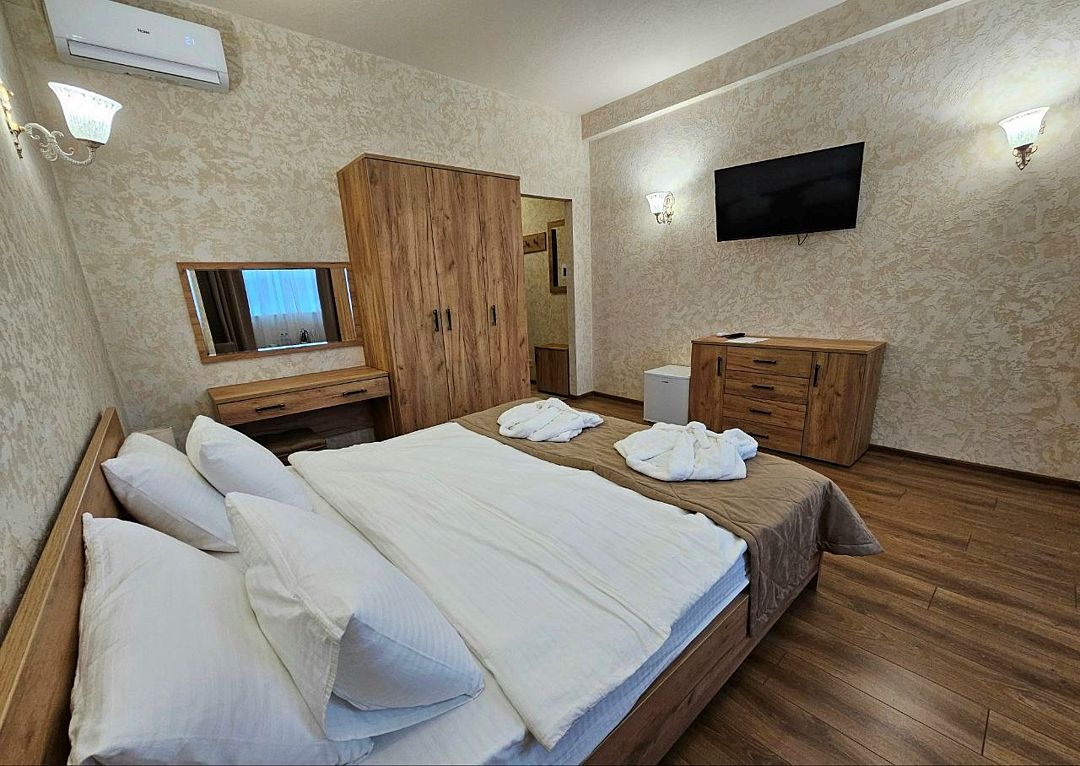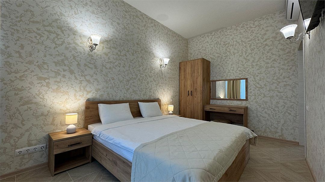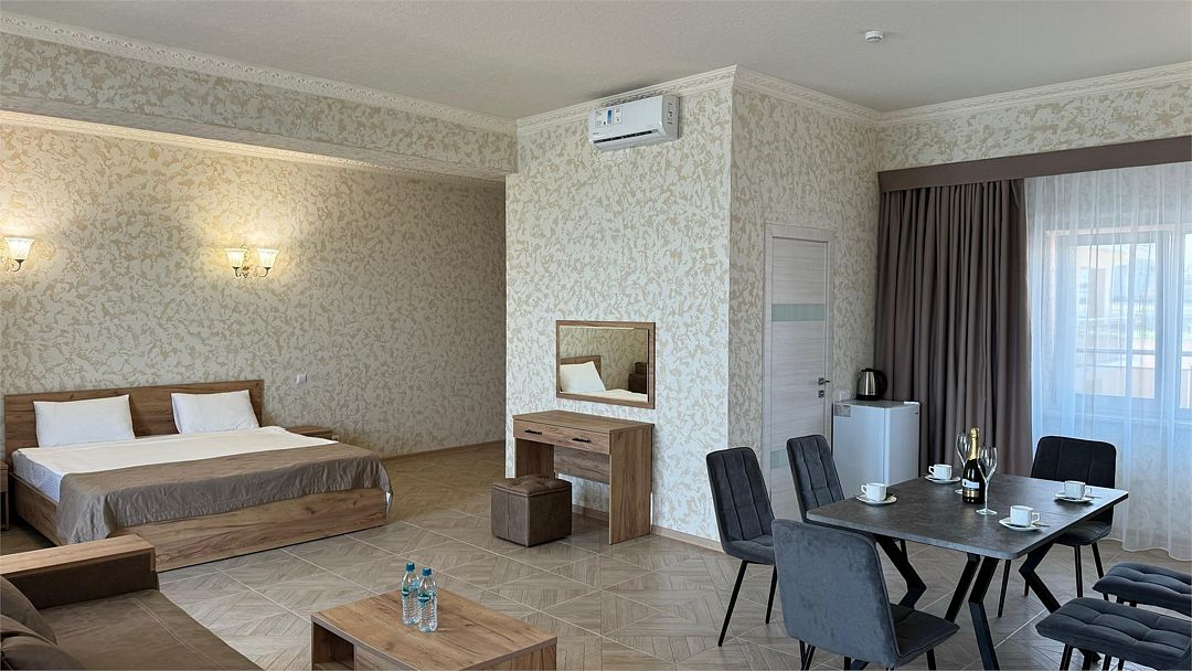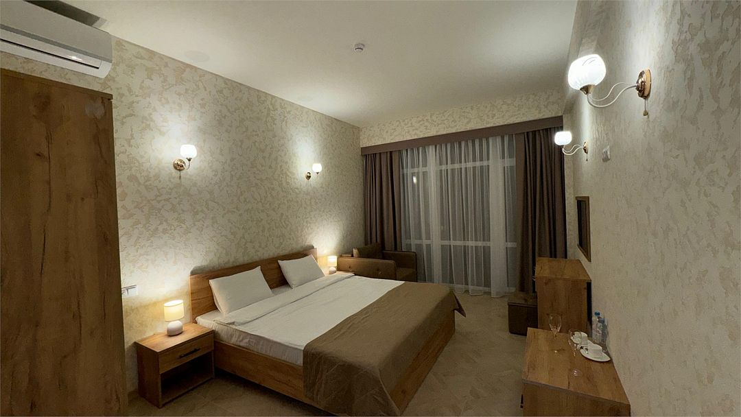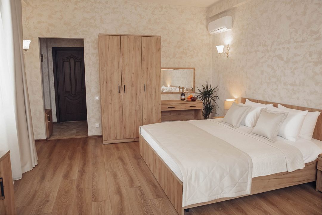 Wi-Fi, кондиционер, фен, утюг, ванна или душевая кабина, теплый пол, халаты, банные полотенца, тапочки, гладильная доска, шкаф для одежды, вешалки, журнальный столик, зеркало, чайный набор, обслуживание номеров, сейф, минеральная вода, унитаз, раковина, косметическое зеркало, вид на море, вид на город, кулер на этаже, вид во двор, ламинат, высокие потолки, две кровати «King size», стаканы, туалетный столик, туалетные средства, туалет, мангал, мини-холодильник, москитная сетка, частичный вид на море, телевизор со Smart TV, теплые полы, номер для некурящих, пуфик, оснащение для гостей с ограниченными возможностями, два раскладных кресла, набор для приготовления чая и кофе, услуги прачечной (платно), вешалки-плечики, приветственная фруктовая тарелка в номер, мини-бар (платно), шапочка для душа, частный двор, мыло, можно с питомцамиВ гостиничном номере