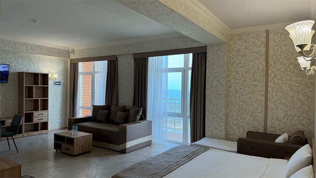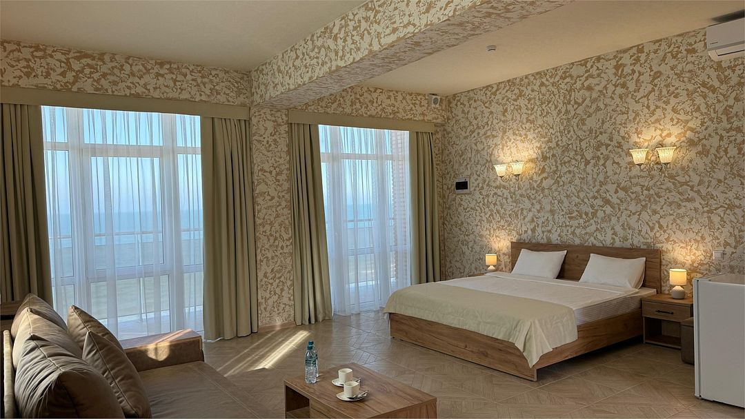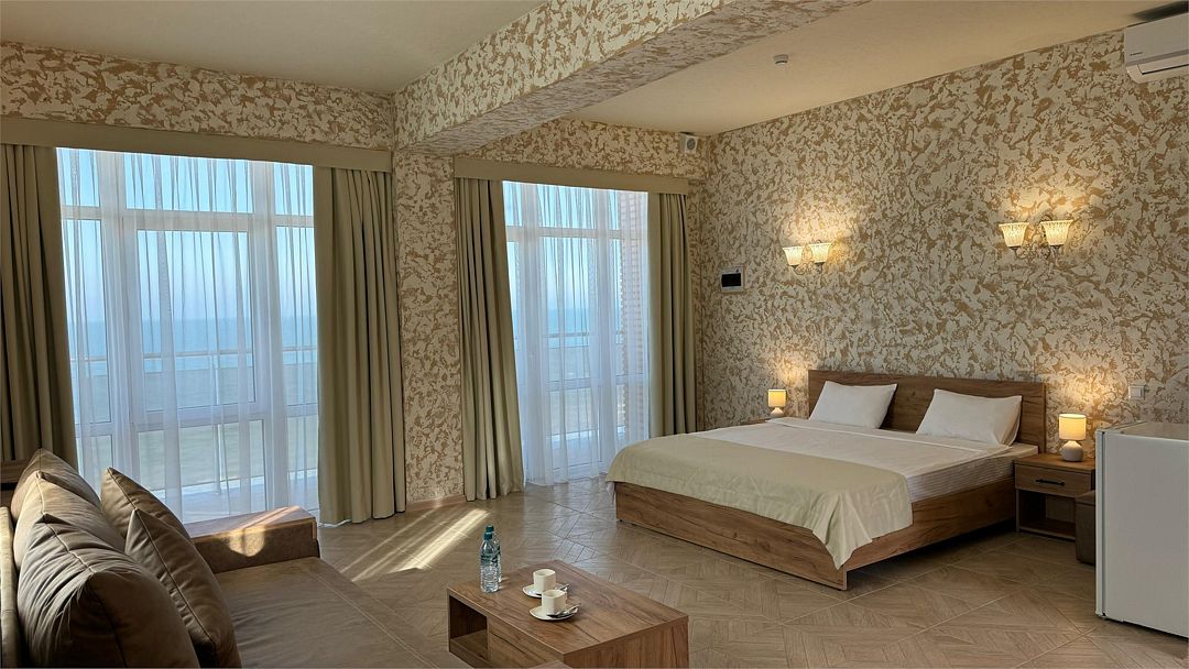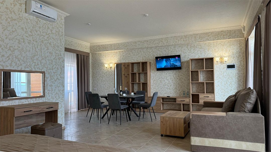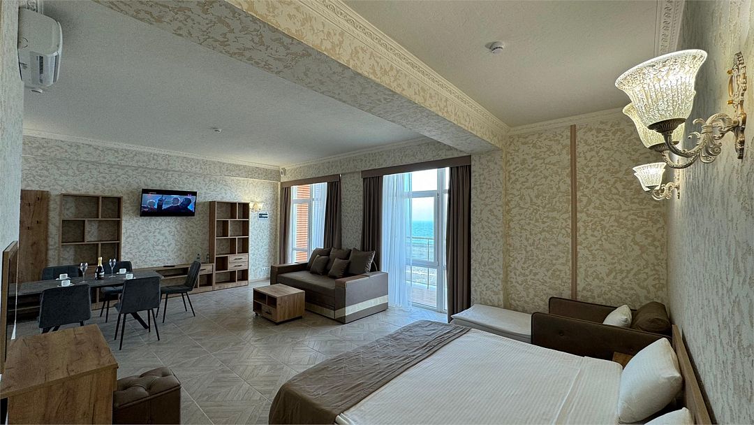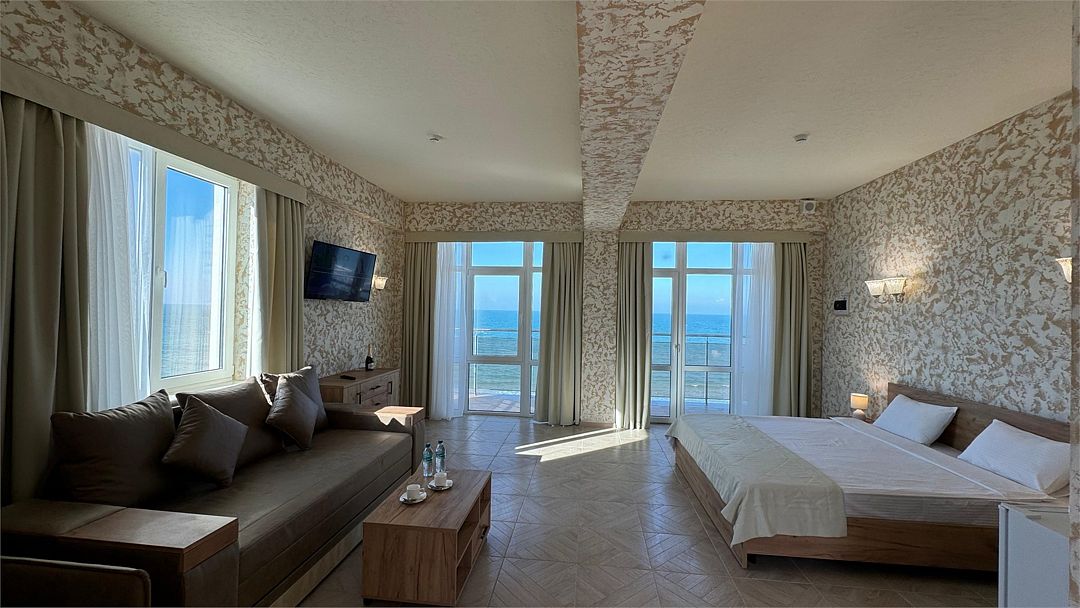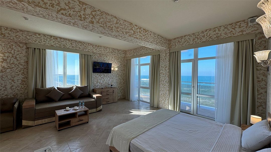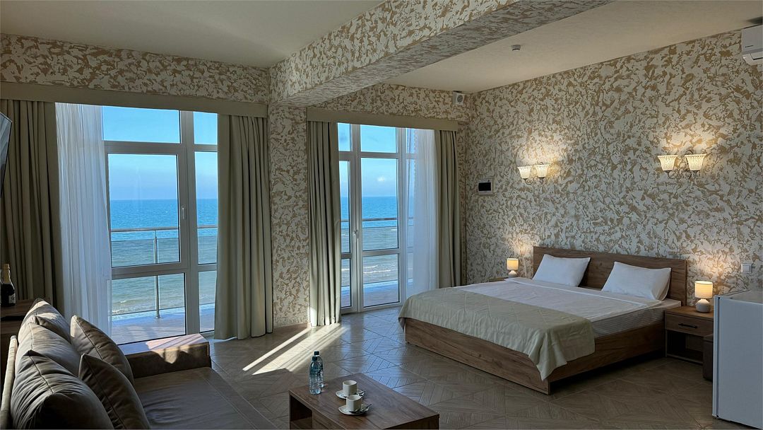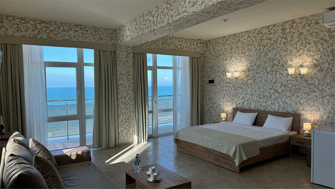 Просторный двухкомнатный номер. Подходит для отдыха как семьи так двум разным компаниям. Панорамные окна выходят на море со своим большим балконом. При выходе из номера во внутренний двор открывается вид прекрасный уличный бассейнУслуги и удобства