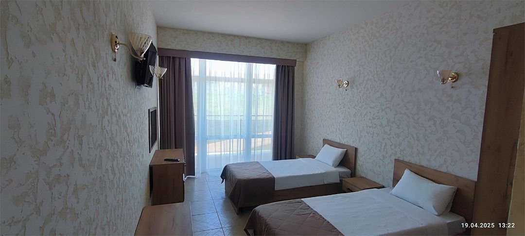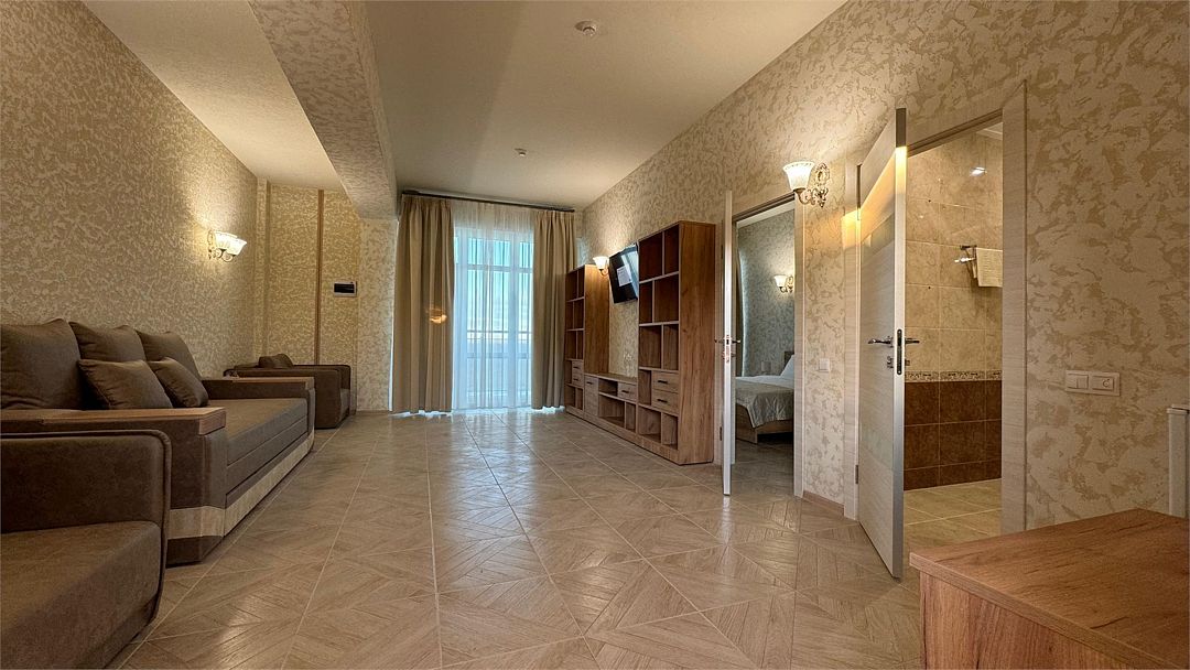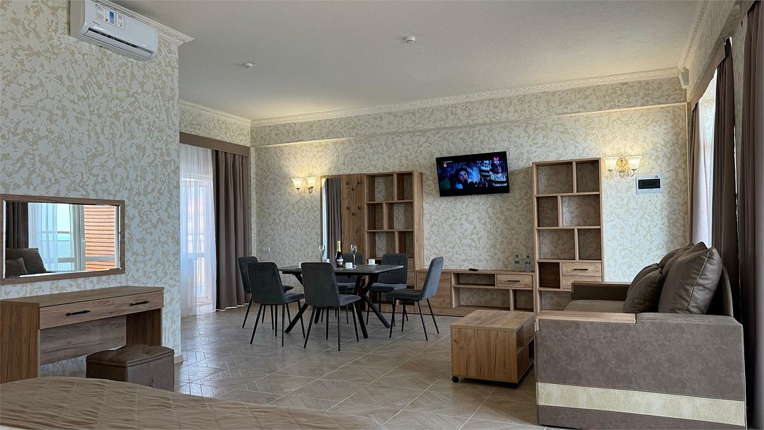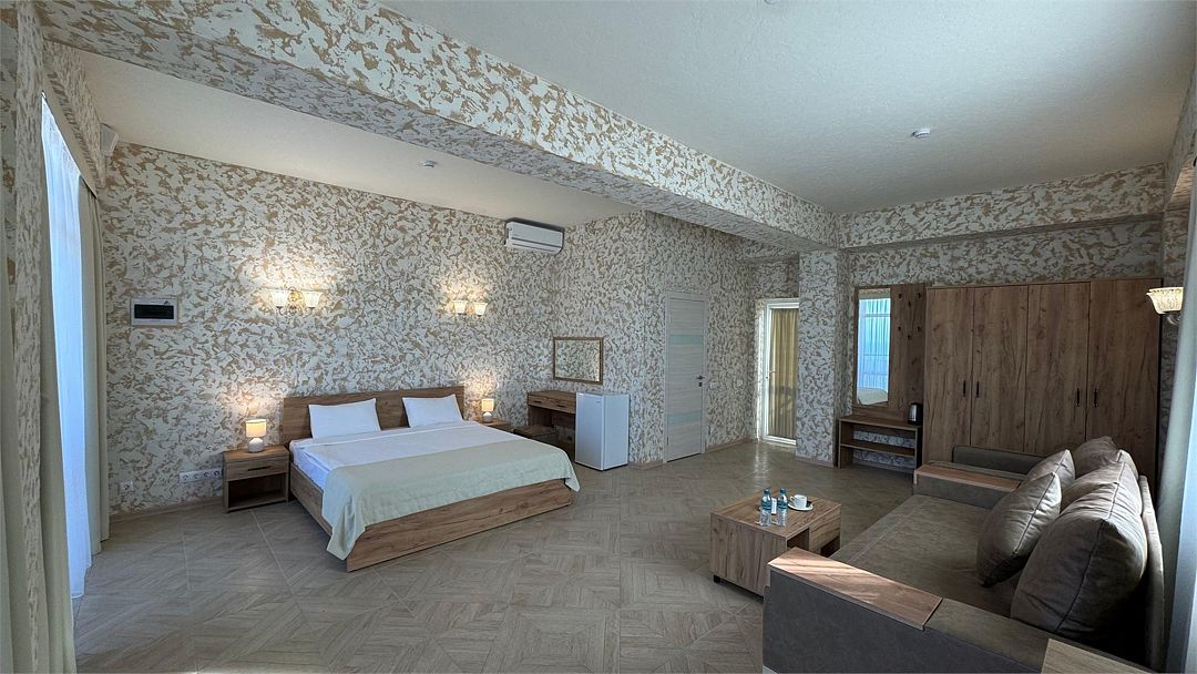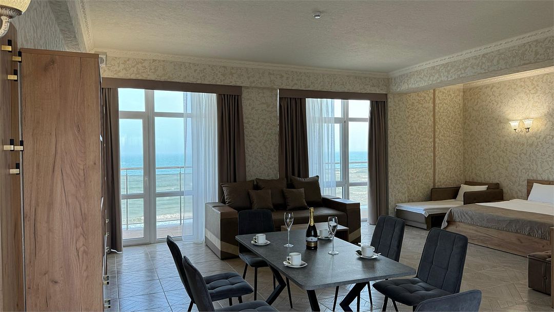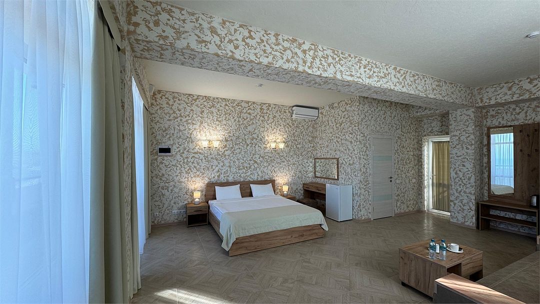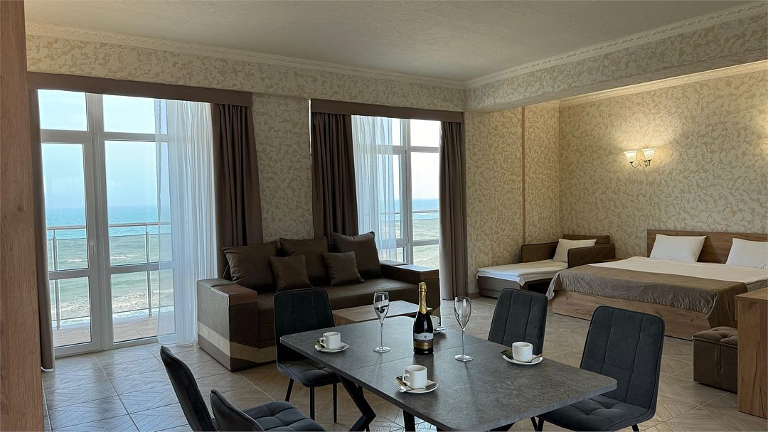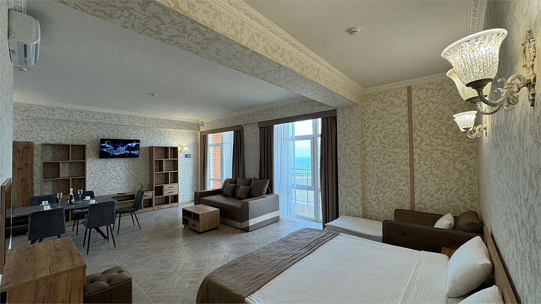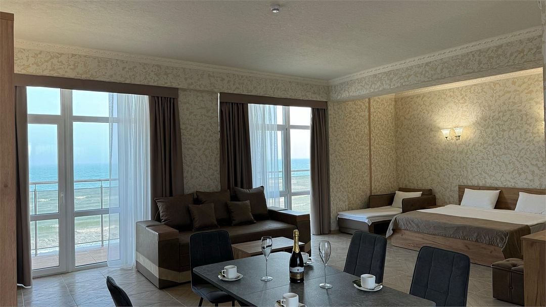 Просторный двухкомнатный номер. Подходит для отдыха как семьи так двум разным компаниям. Панорамные окна выходят на море со своим большим балконом. При выходе из номера во внутренний двор открывается вид прекрасный уличный бассейнУслуги и удобства