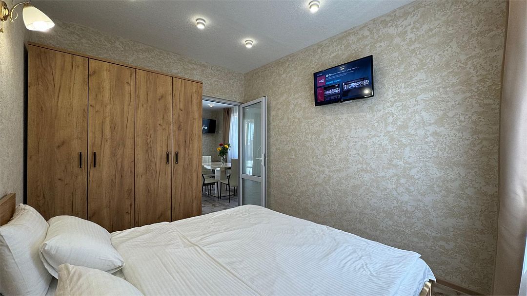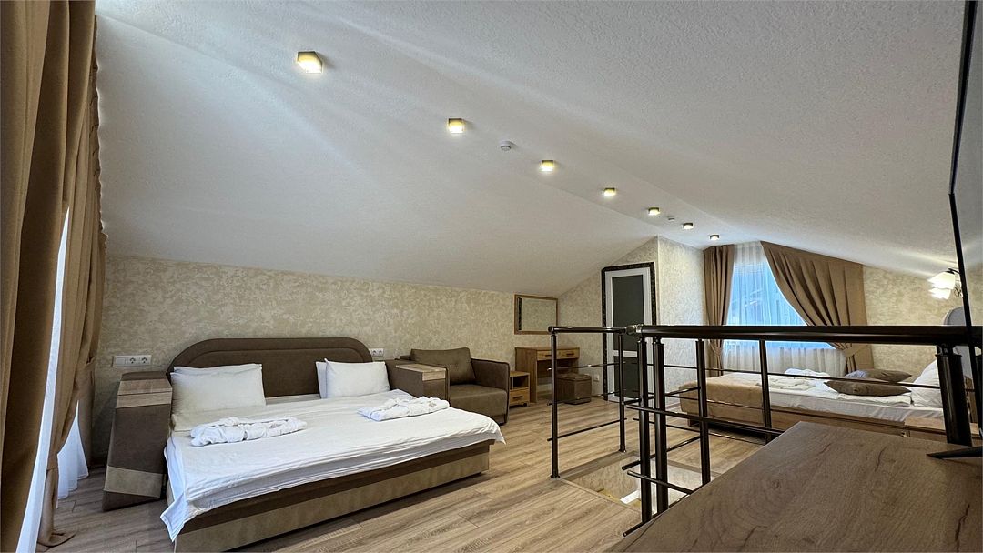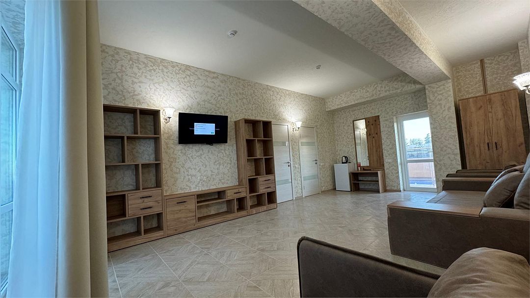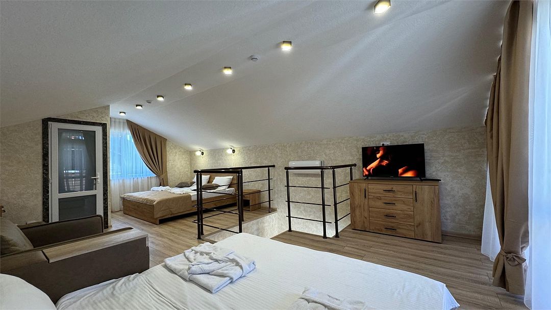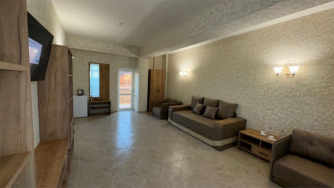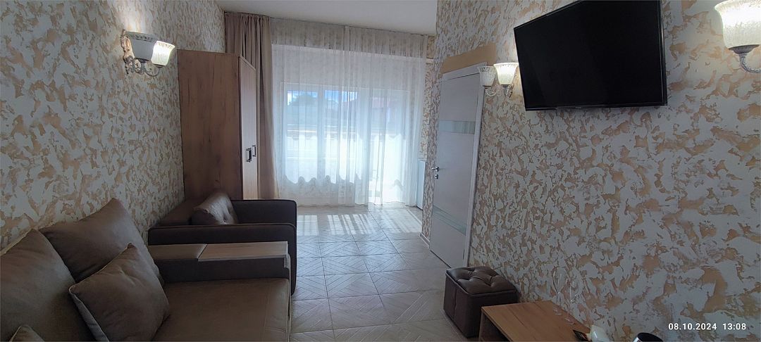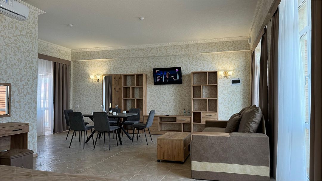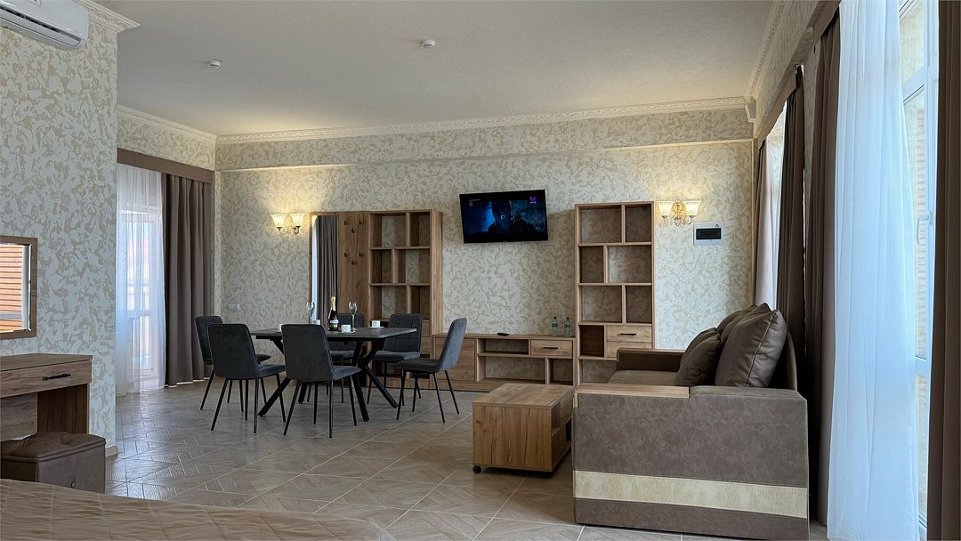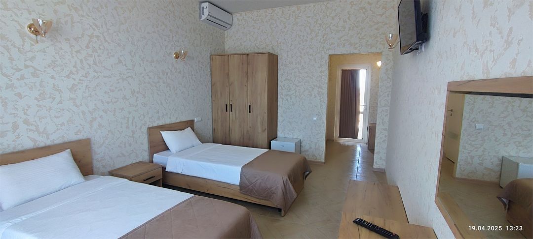 Просторный двухкомнатный номер. Подходит для отдыха как семьи так двум разным компаниям. Панорамные окна выходят на море со своим большим балконом. При выходе из номера во внутренний двор открывается вид прекрасный уличный бассейнУслуги и удобства