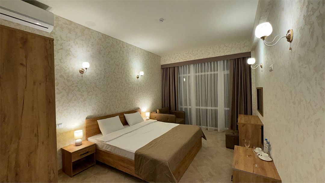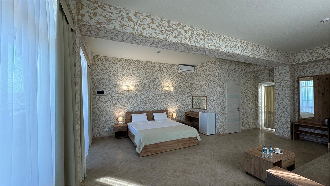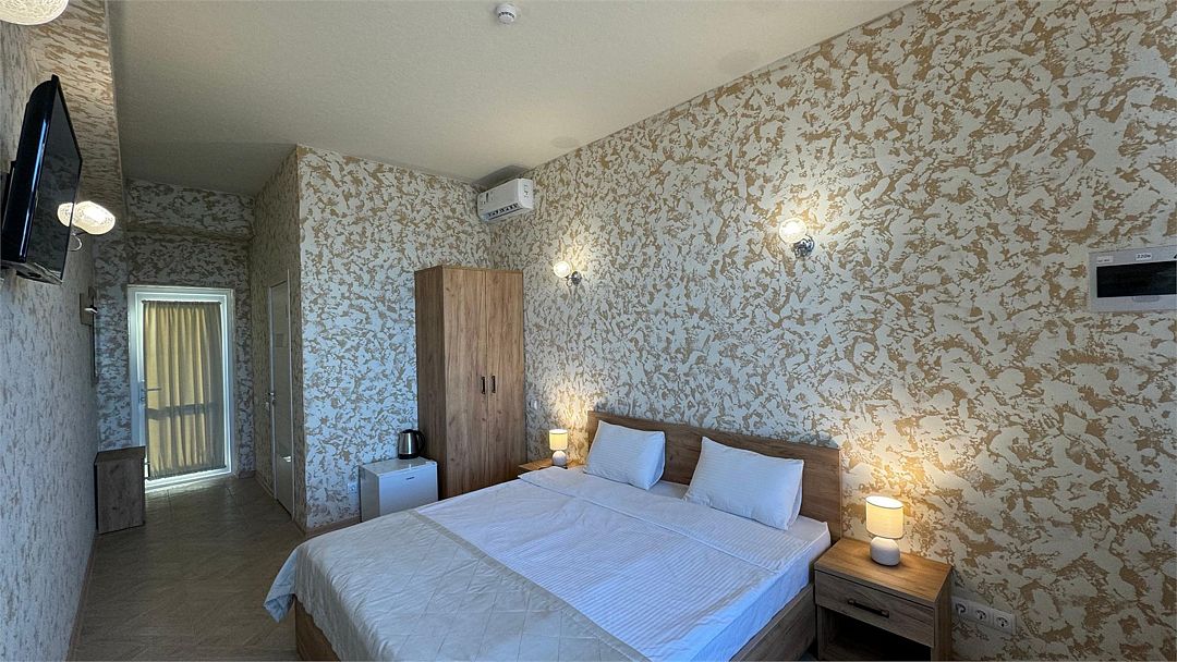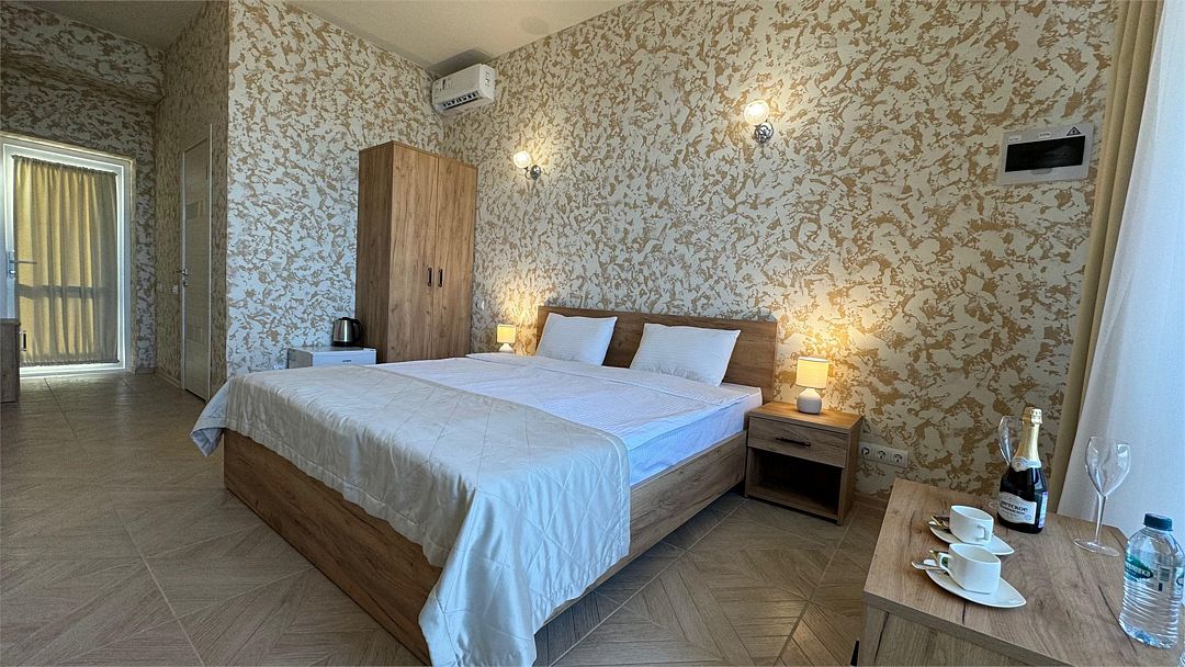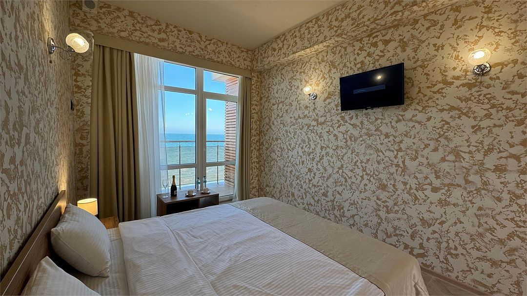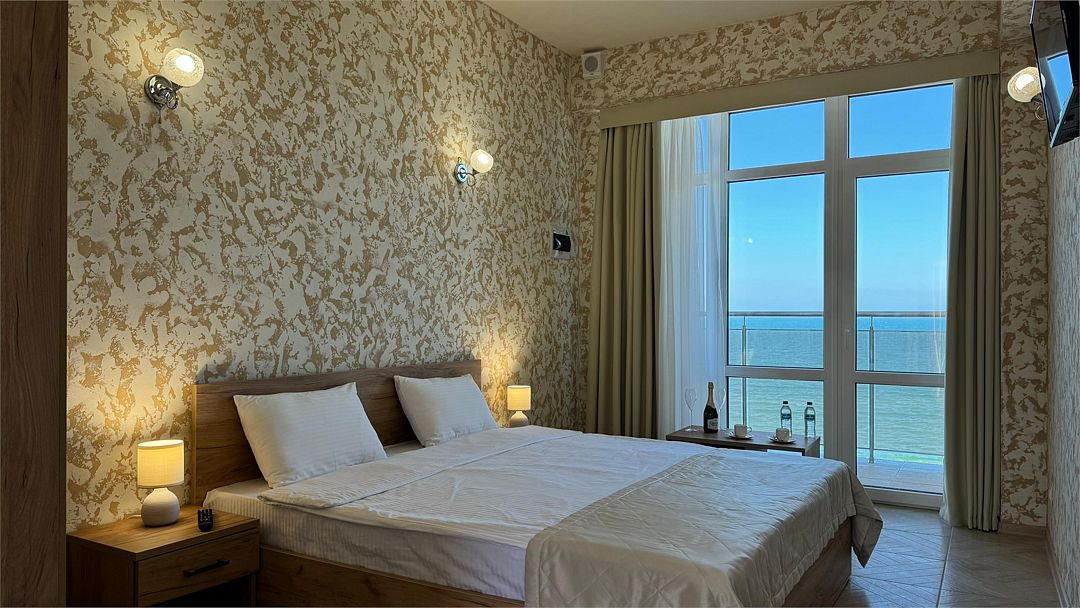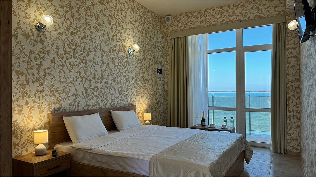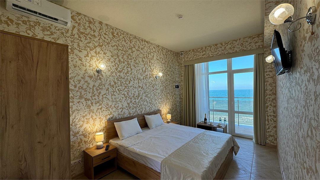Wi-Fi, кондиционер, ванна или душевая кабина, санузел, теплый пол, халаты, пляжные полотенца, тапочки, балкон, балкон с красивым видом, кровать «King size», тумбы, шкаф для одежды, чайник, унитаз, раковина, отдельный вход в номер, вид на море, вид во двор, туалетный столик, туалетные средства, туалет, панорамные окна, мини-холодильник, телевизор со Smart TV, вид на бассейн, шапочка для душа, мыло, можно с питомцамиВ гостиничном номере