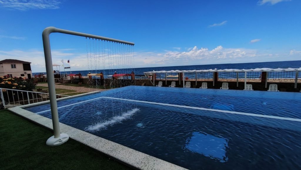 Открытый Инфинити бассейн с видом на море открытый переливной бассейн Инфинити общий размер 14м*7м; детская зона 11м*3м. Глубина детского бассейна: 0,4м-0,9м; глубина взрослого: 1,45м; функция подогрева и охлаждения воды; противоток в бассейне для взрослых; бассейн оснащен гейзерами; водяная шторка для в детском бассейне.