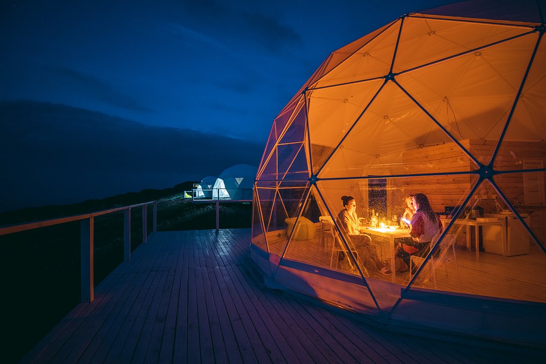 Путешествие с паройУдивительное сочетание дикой природы и комфорта!Место для любителей релакса под шум волн и ветра, рядом песчаный дикий пляж, приятный для купания, могут быть волны, но вода очень чистая! И в тоже время чистота, душ, туалет , холодильник и доставка еды по меню (вкусная). Алексей все подробно расскажет и поможет решить все вопросы. Немного критики: панорамные окна в куполах-пора менять материал, мутные! Если будет возможность-еще приедем!