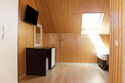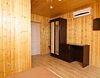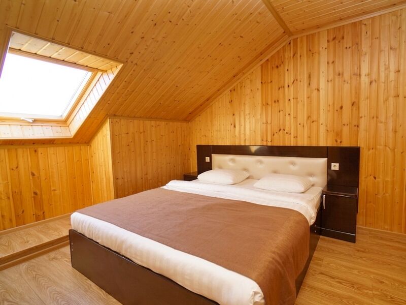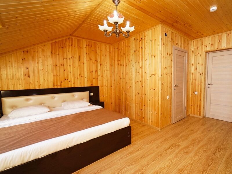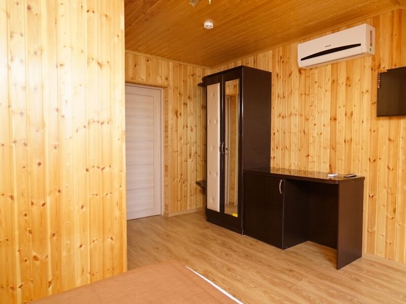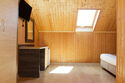 Номер не имеет балкона, его стены и потолок выполнены из дерева.