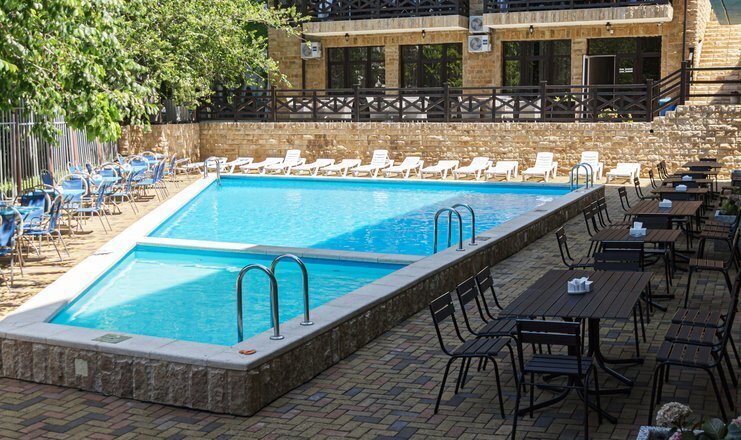 На благоустроенной территории отеля "Лайтхаус" в Лермонтово расположен открытый бассейн с отделением для детей и зоной отдыха.