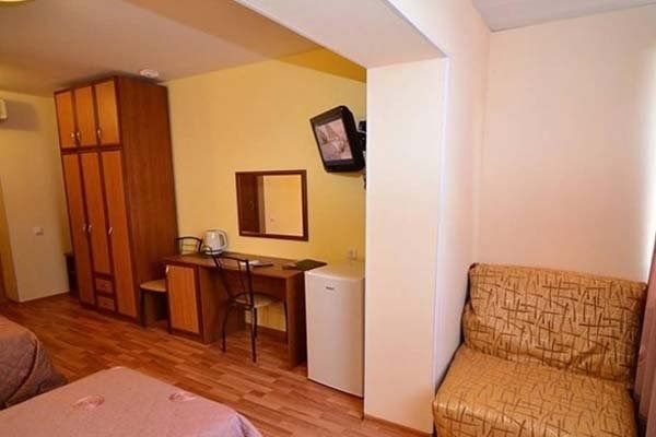 В номере: три кровати, стол журнальный, телевизор, холодильник, шкаф, душ, туалет. В комплектацию номера входит комплект постельного белья, комплект полотенец.