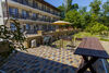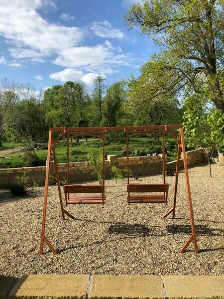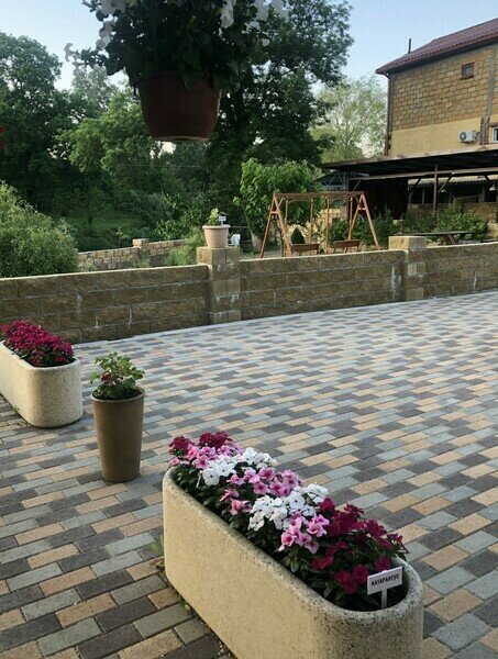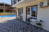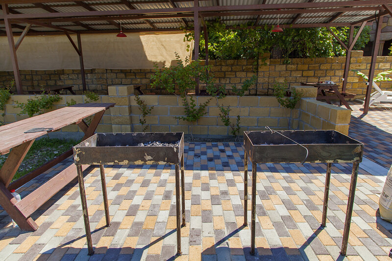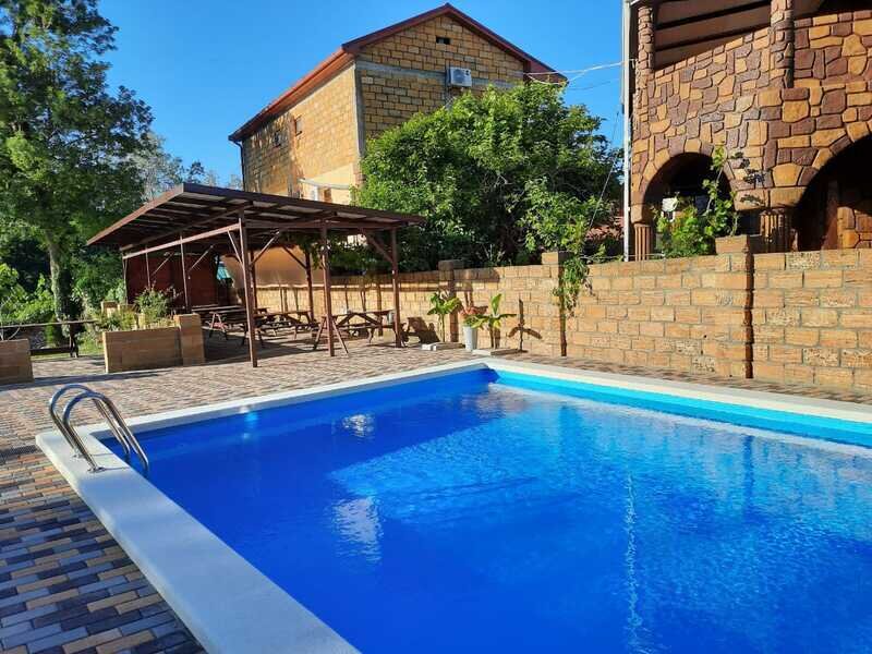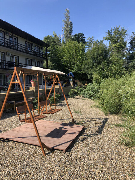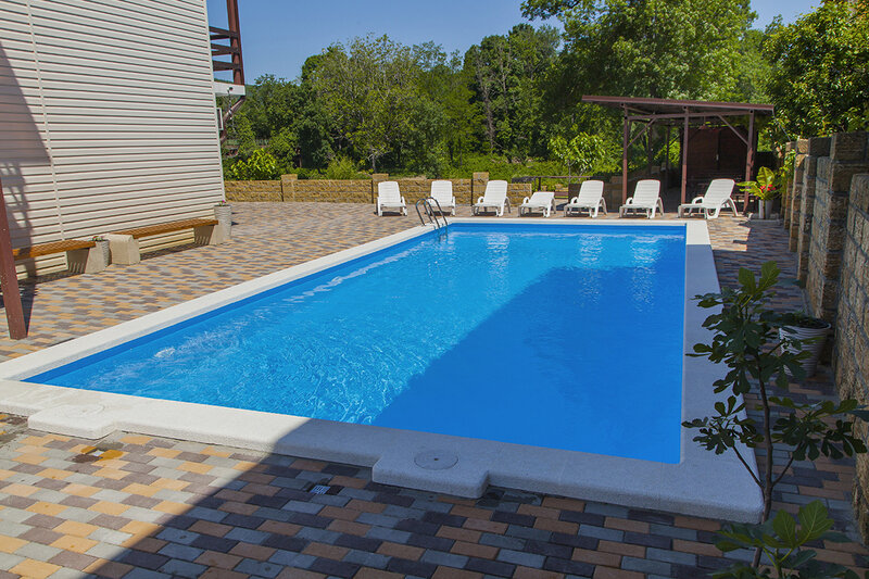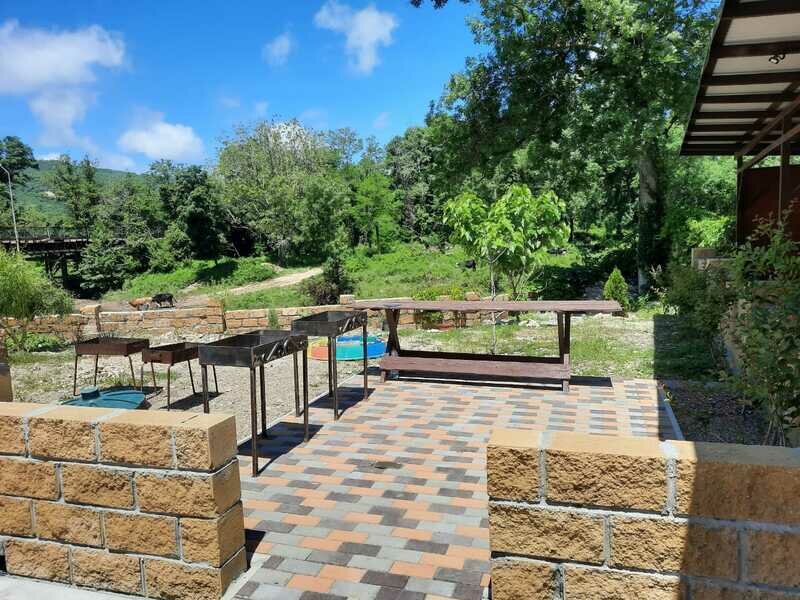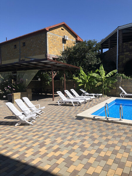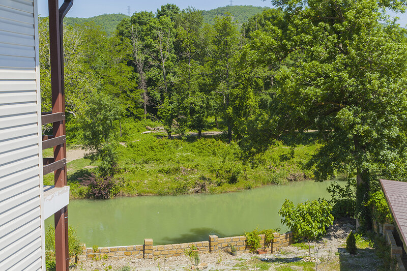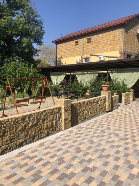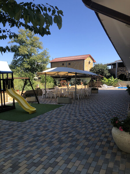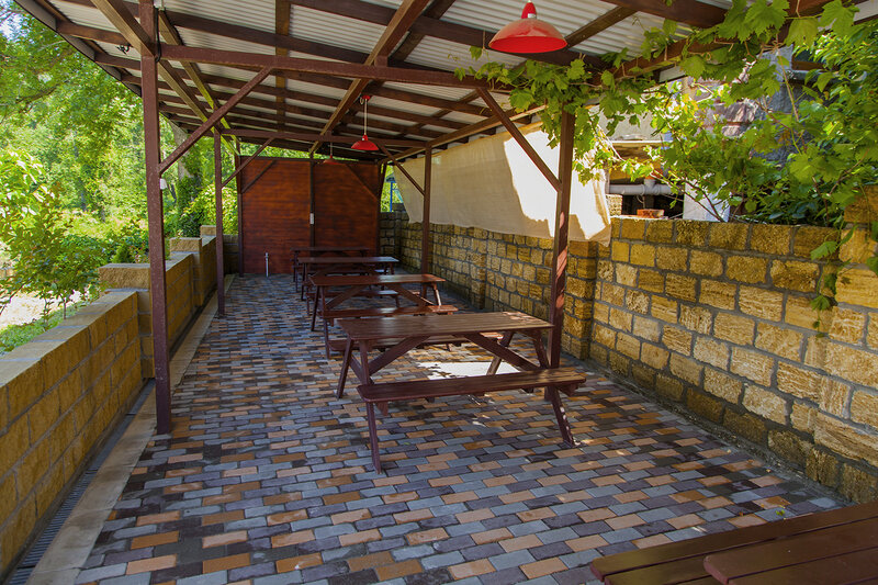 На просторной и облагороженной территории уложенной брусчаткой, расположен капитальный бассейн 5×11 с шезлонгами, мангальная зона с тенистой беседкой. На первом этаже здания большое помещение обеденной зоны. Для автомобилей имеется парковка во дворе. С территории участка есть бесплатная возможность ловить рыбу в полноводной реке Шапсухо.
