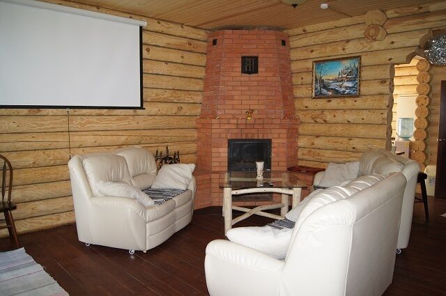 - просторный каминный зал с домашним кинотеатром, проектором, комфортной мягкой мебелью, большим столом для отдыха и заседаний;
