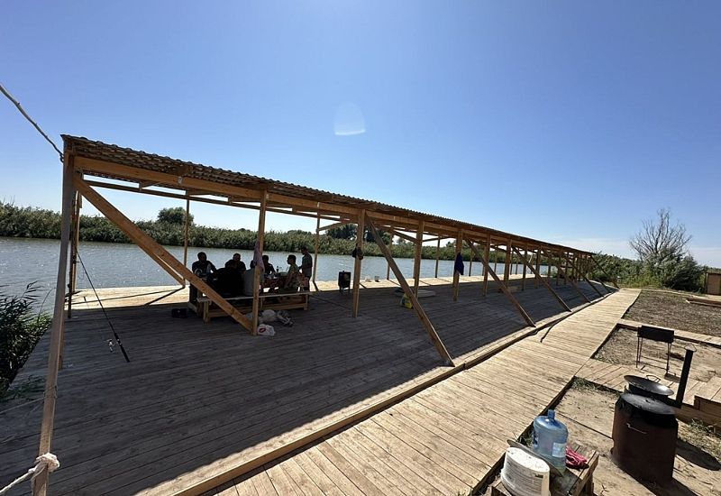 Крытый пирс с зонами отдыха (стол, лавочки) для каждого из домиков.