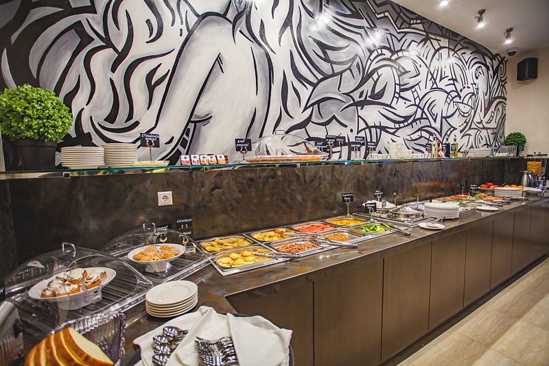 Каждое утро с 07.00 до 10.00 здесь накрывают завтрак по системе «шведский стол». Основное меню кафе представляет широкий выбор блюд для посетителей с самыми разнообразными кулинарными предпочтениями — от горячей сковороды с жареным мясом до овсяной каши на молоке. Кафе работает с 07:00 до 23:00.