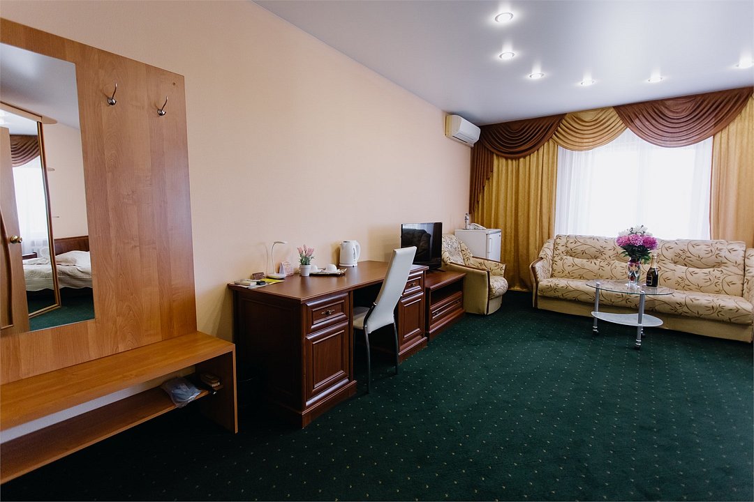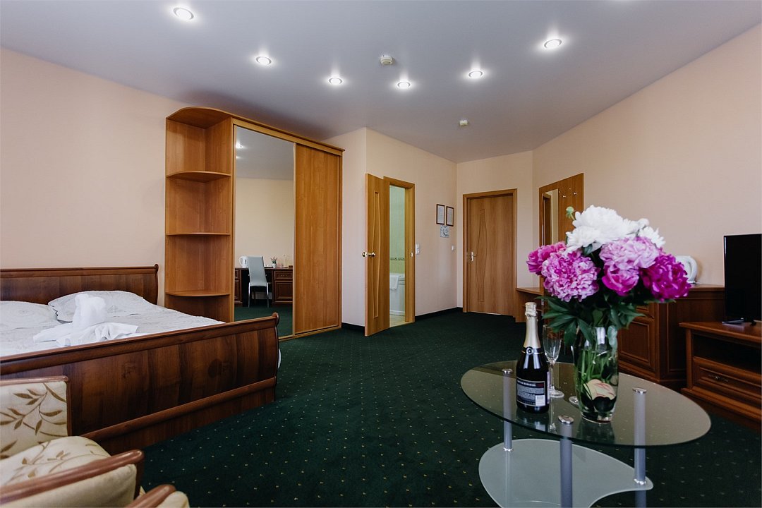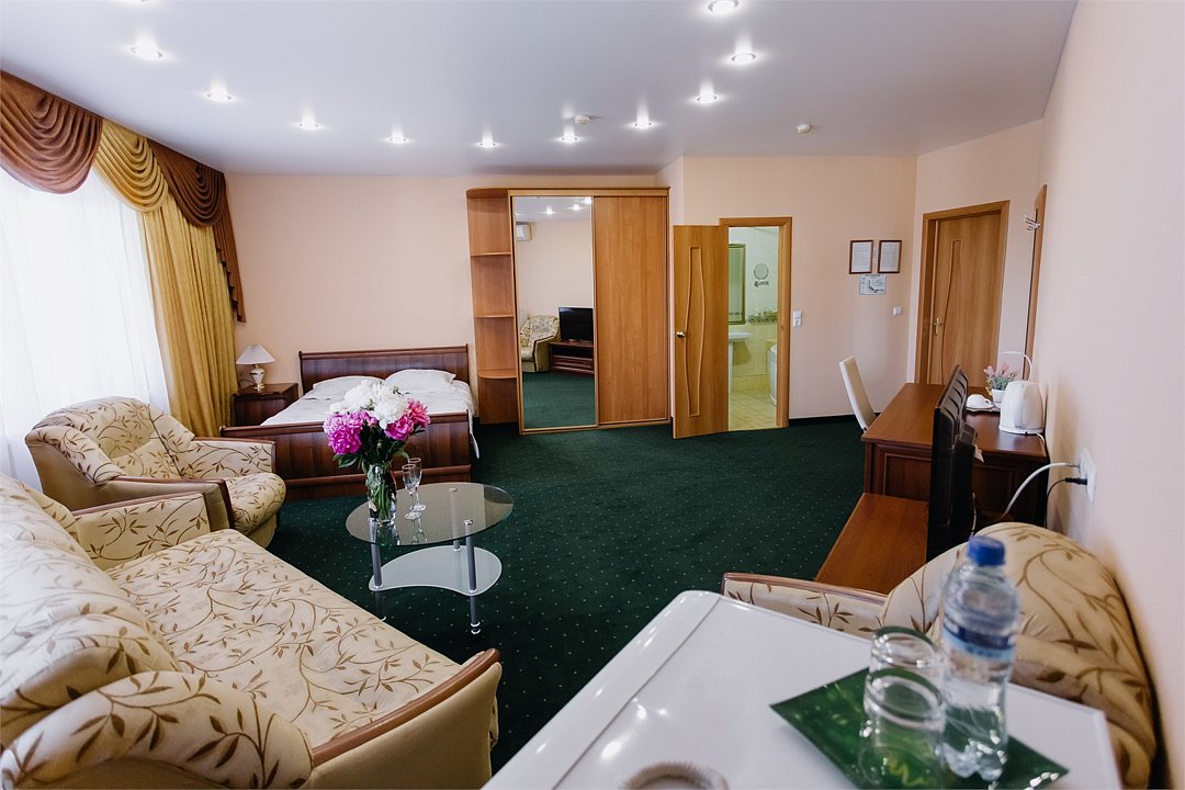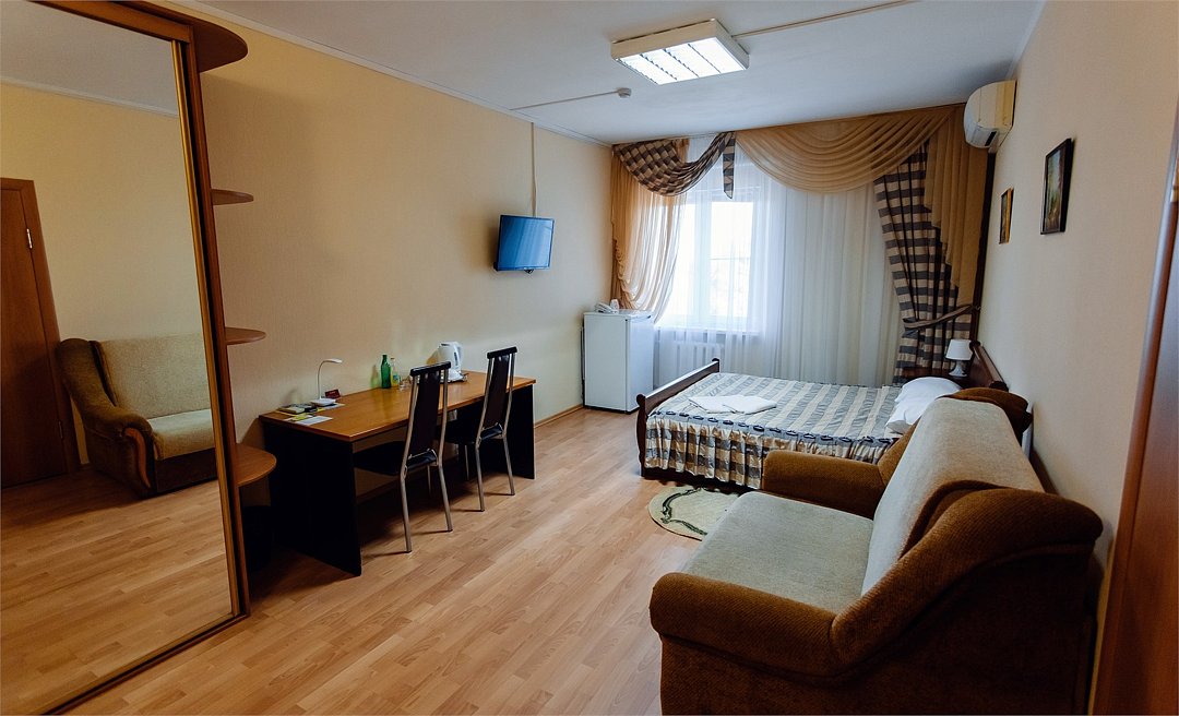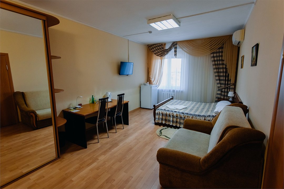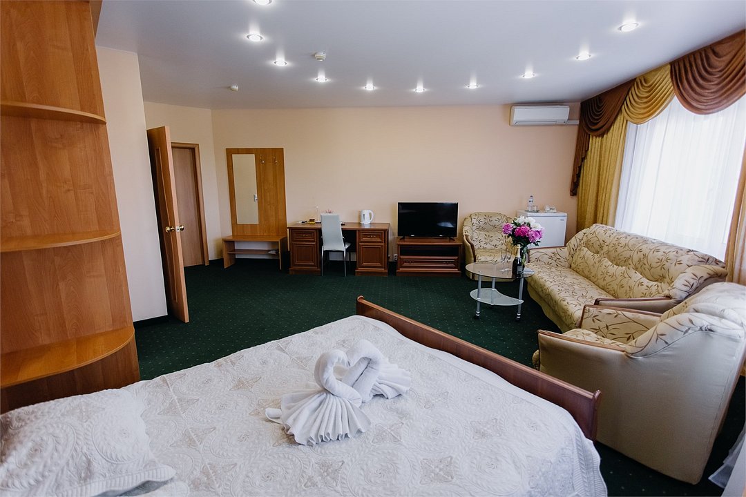 Уютный номер бизнес класса, площадью 31 кв.м. для размещения одного, двух или трех человек. Гостями такого номера могут быть молодожены, а также пары, желающие отметить годовщину свадьбы, специально для Вас мы создадим в номере уютную атмосферу для двоих! В комнате одна большая кровать, прикроватные тумбочки, чайный столик, диван с креслом, телефон, телевизор, шкаф-купе. Оставайтесь всегда на связи, пользуясь Wi—Fi, работайте с удовольствием на удобном и просторном рабочем месте в вашем номере. Дополнительный комфорт вашему проживанию придаст индивидуальная система кондиционирования, просторная ванная комната с зеркалом, феном, ванной и необходимыми косметическими принадлежностями.Услуги и удобства