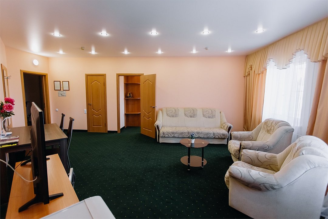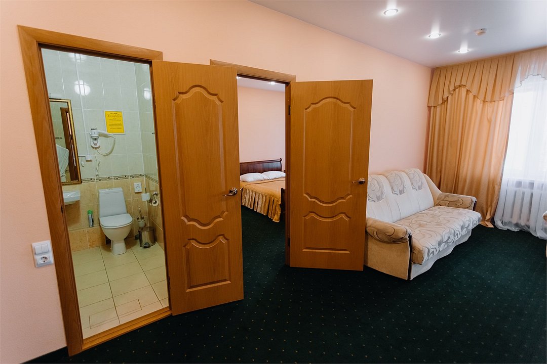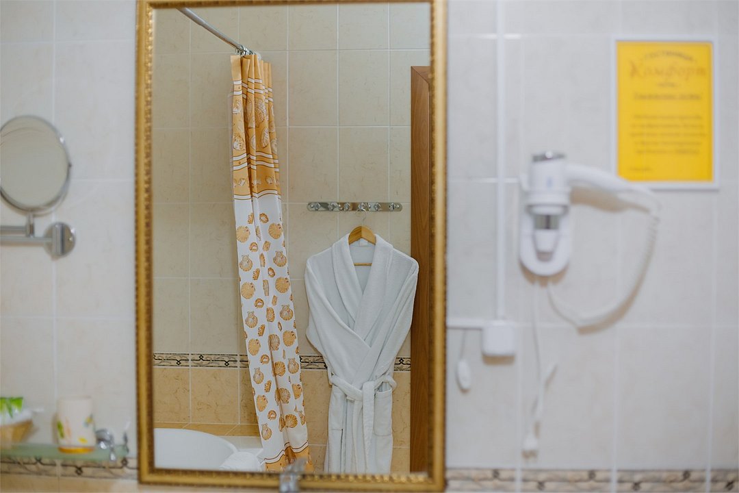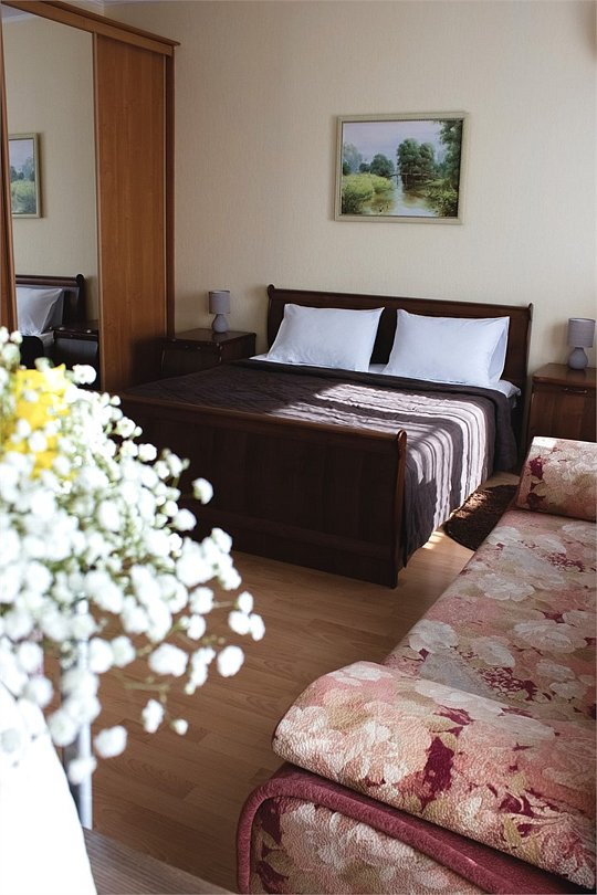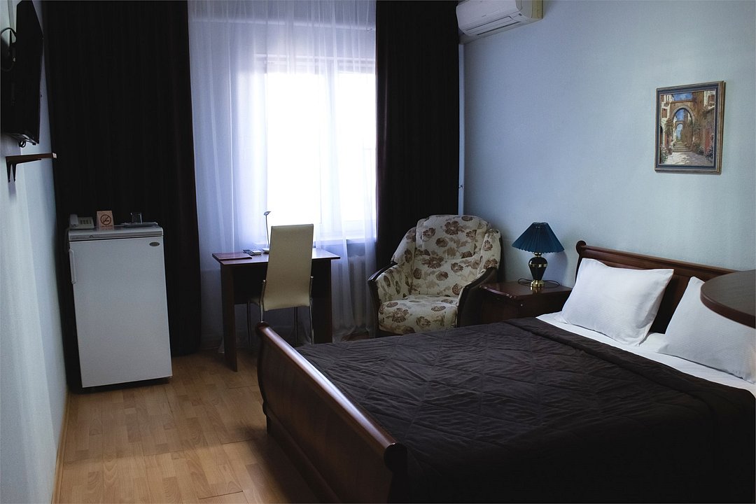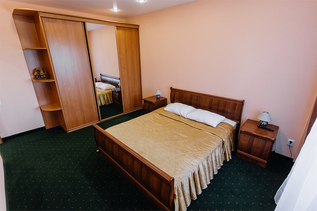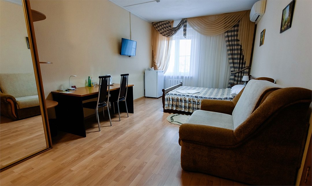 Уютный номер бизнес класса, площадью 31 кв.м. для размещения одного, двух или трех человек. Гостями такого номера могут быть молодожены, а также пары, желающие отметить годовщину свадьбы, специально для Вас мы создадим в номере уютную атмосферу для двоих! В комнате одна большая кровать, прикроватные тумбочки, чайный столик, диван с креслом, телефон, телевизор, шкаф-купе. Оставайтесь всегда на связи, пользуясь Wi—Fi, работайте с удовольствием на удобном и просторном рабочем месте в вашем номере. Дополнительный комфорт вашему проживанию придаст индивидуальная система кондиционирования, просторная ванная комната с зеркалом, феном, ванной и необходимыми косметическими принадлежностями.Услуги и удобства