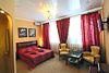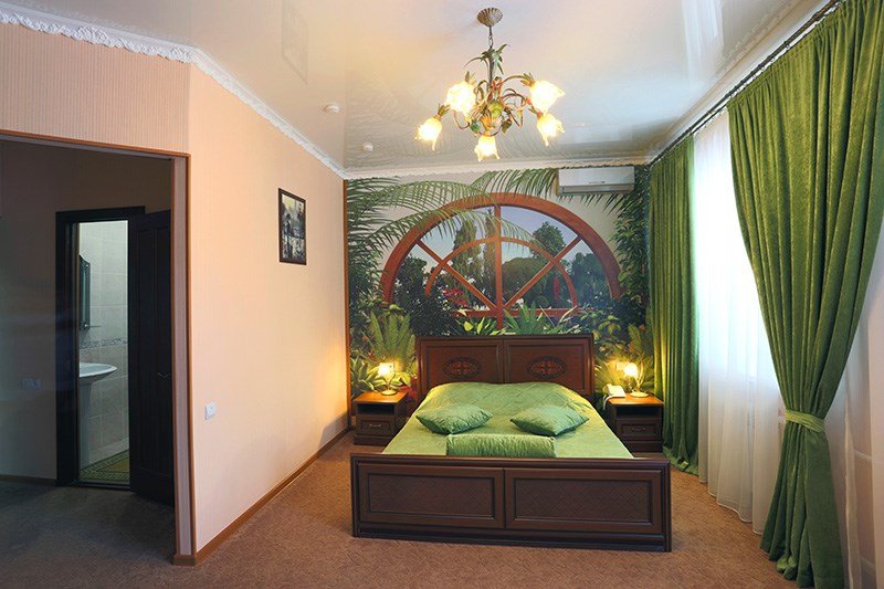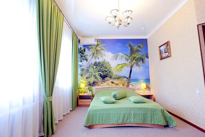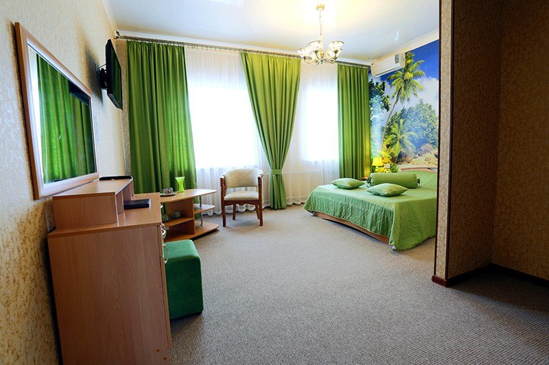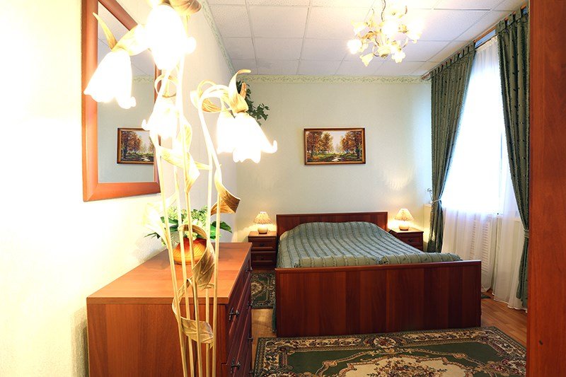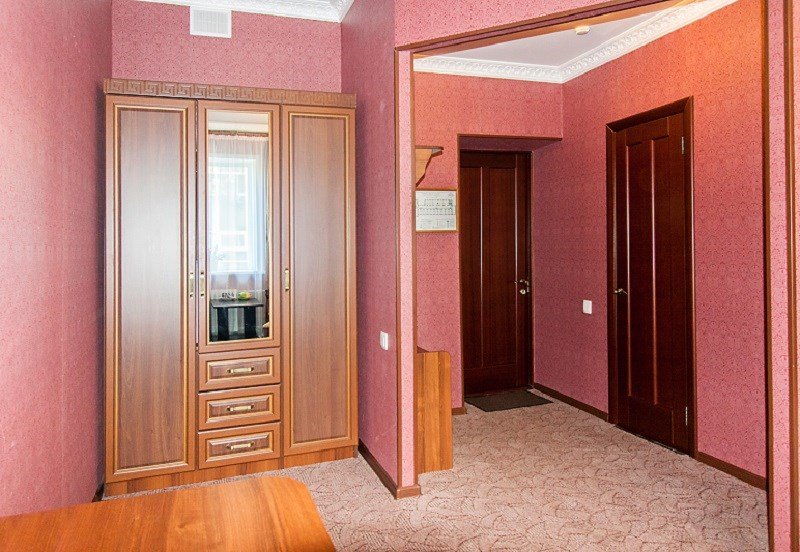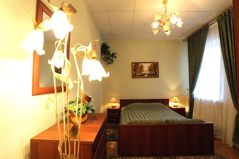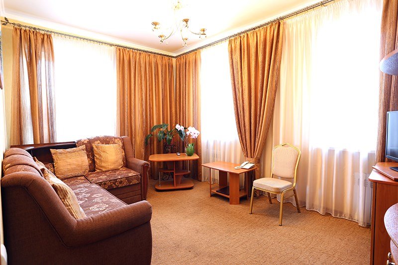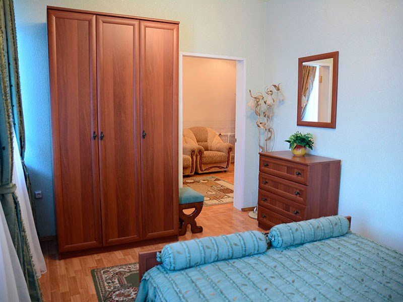 Просторный, комфортабельный, двухкомнатный номер (гостиная и спальня), подходит как для работы, так и для отдыха. Здесь царит атмосфера домашнего уюта и комфорта. В гостиной мягкая мебель, журнальный столик, телевизор (кабельное телевидение), бесплатный WI-FI,кондиционер, телефон, холодильник, посуда. В спальне 2 двуспальные кровати с ортопедическими матрацами. Гостям предоставляются: индивидуальные средства гигиены, комплекты полотенец из 3х шт., банные халаты, тапочки, фен. Санузел оборудован душевой кабиной, водонагревателем, что обеспечивает бесперебойное наличие горячей воды даже в период сезонного отключения. Номера оборудованы противопожарной системой, что делает пребывание в нём наиболее безопасным. В стоимость проживания включен завтрак.Услуги и удобства