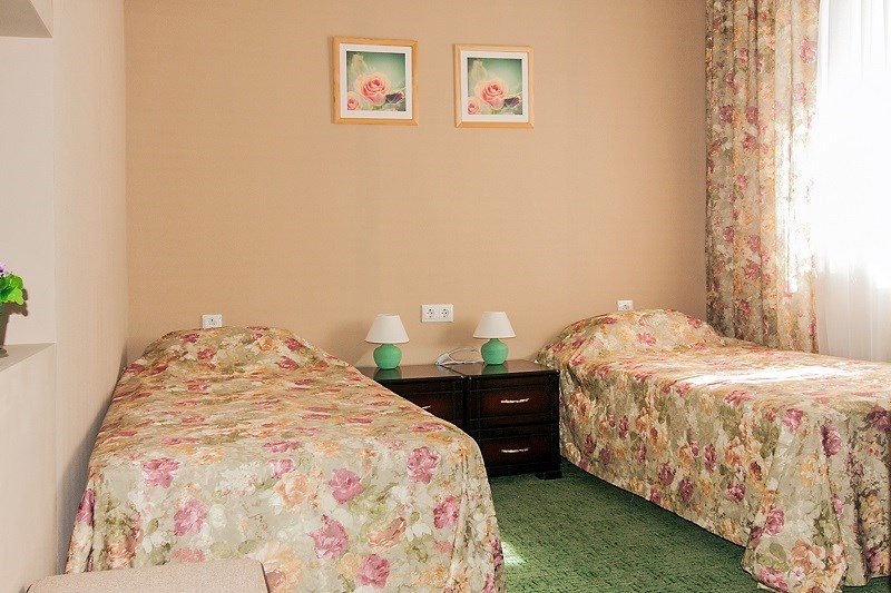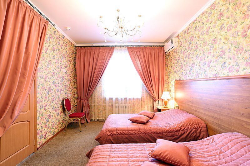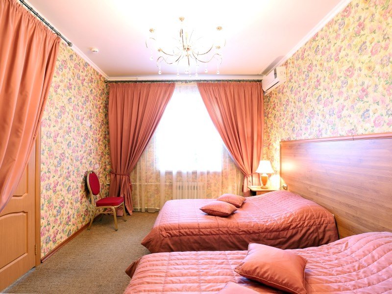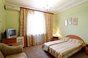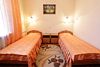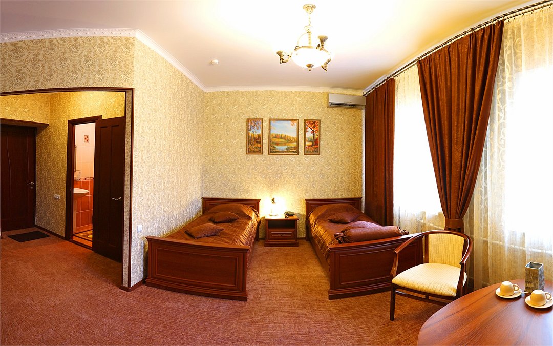 Интерьер просторной комнаты выполнен в стиле благородной роскоши. Мебель из тёмного дерева включает в себя две односпальные кровати с ортопедическими матрацами, шкаф для одежды, журнальный столик, секретер. Уютная обстановка номера позволит Вам провести здесь как деловую встречу и просто отдохнуть. Окна номера выходят во двор гостиницы, это позволит Вам оценить тишину и отсутствие городского шума. В стоимость проживания включен завтрак.Услуги и удобства