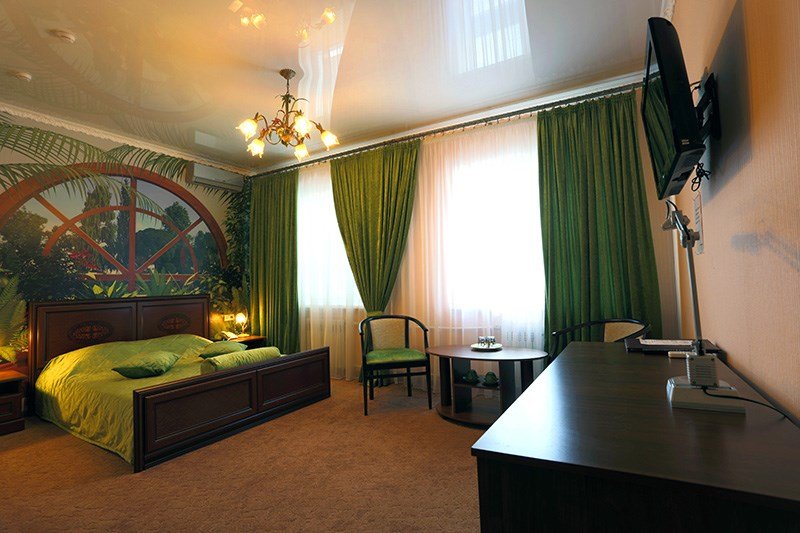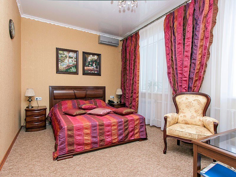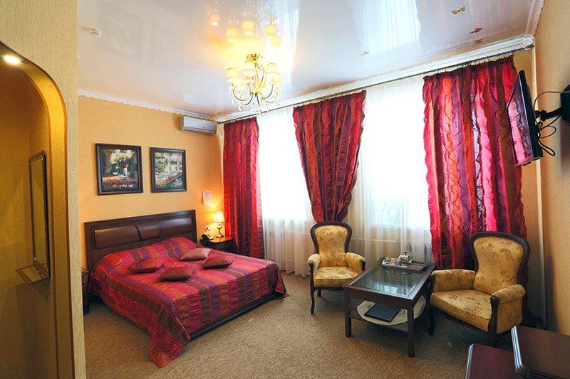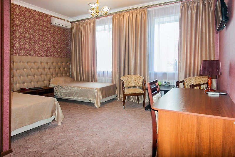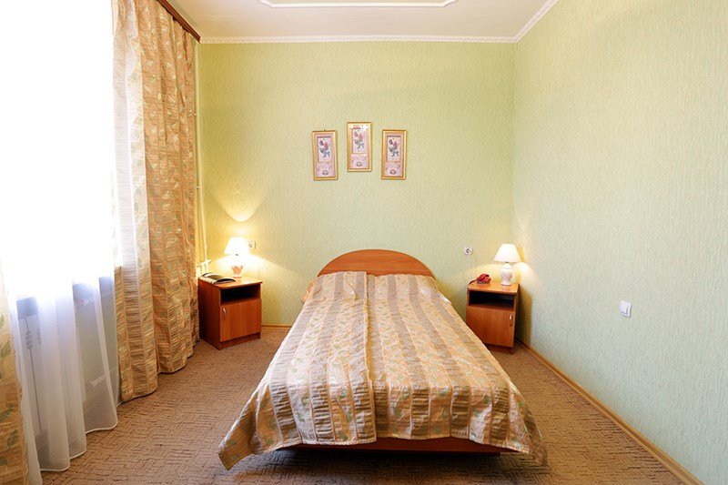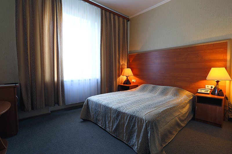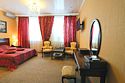 Интерьер просторной комнаты выполнен в стиле благородной роскоши. Мебель из тёмного или светлого дерева включает в себя просторную двуспальную кровать с ортопедическим матрацем, шкаф для одежды, журнальный столик, секретер. Уютная обстановка номера позволит Вам провести здесь как деловую встречу, так и романтическое свидание. Окна номера выходят во двор гостиницы, это позволит Вам оценить тишину и отсутствие городского шума. В номере холодильник, телевизор, бесплатный WI-FI, кондиционер, посуда, комплект полотенец из 3х шт., индивидуальные средства гигиены, банный халат, тапочки, фен. Санузел оборудован душевой кабиной, водонагревателем, что обеспечивает бесперебойное наличие горячей воды даже в период сезонного отключения. Номера оборудованы противопожарной системой, что делает пребывание в нём наиболее безопасным. В стоимость проживания включен завтрак.Услуги и удобства