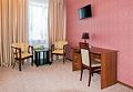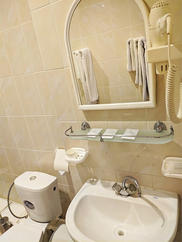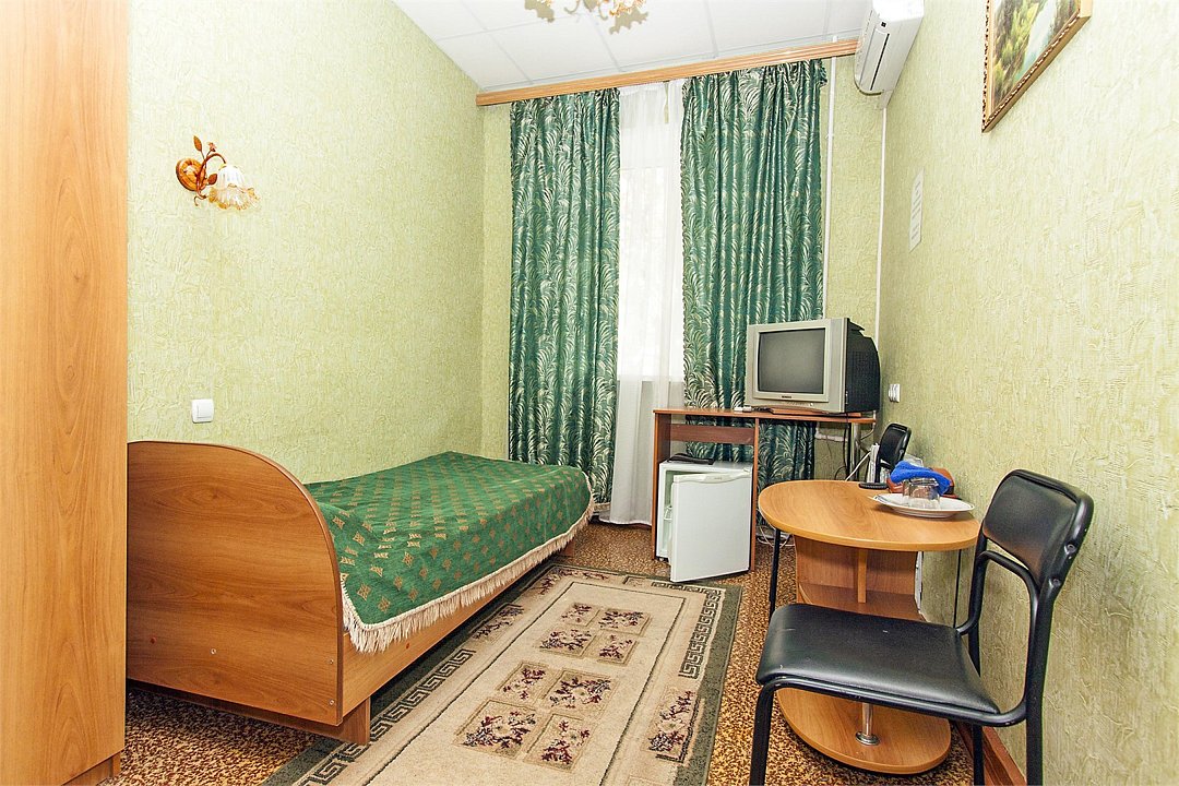 Жил в 1-местном номере Эконом (1445 руб за сутки с питанием, это с учетом 15% скидки при бронировании по Интернету). Номер небольшой, но уютный (10 м2). Потолки высокие, примерно 3 метра. В комнате шкаф с двумя отделениями (в одном плечики для одежды, в другом 6 полок для вещей). Есть стол, 2 стула, телевизор (принимал порядка 40 каналов), маленький холодильник, телефон, В прихожей раковина 2 зеркала. Туалет и душ на этаже. Кровать немного жестковатая. Освещение неплохое. В номере были 2 стакана с тарелкой.