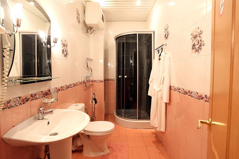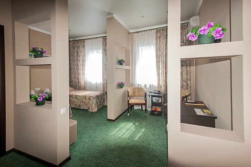 Элегантный, комфортабельный номер. В распоряжении гостя: холодильник, телевизор, бесплатный WI-FI, кондиционер, посуда, комплект полотенец из 3х шт., индивидуальные средства гигиены, банный халат, тапочки, фен. Санузел оборудован душевой кабиной, водонагревателем, что обеспечивает бесперебойное наличие горячей воды даже в период сезонного отключения. Номера оборудованы противопожарной системой, что делает пребывание в нём наиболее безопасным. Из окна номера открывается прекрасный вид на центральную часть нашего города. В стоимость проживания включен завтрак.Услуги и удобства