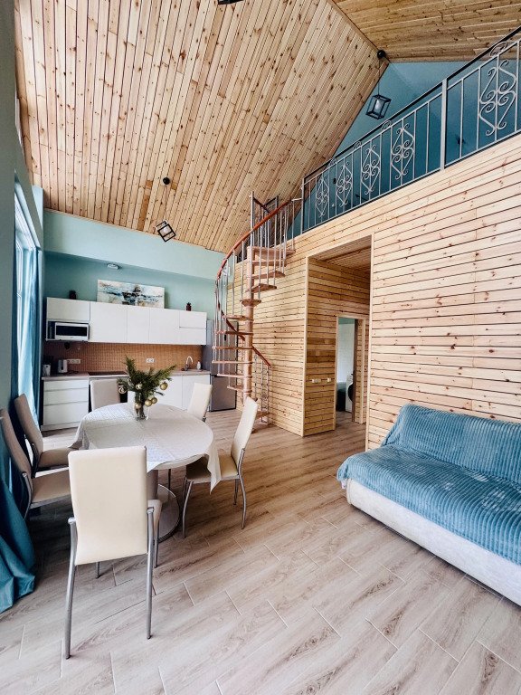 В доме просторная гостиная с большими окнами и видом на природу, кухня с современными удобствами, уютные спальни с комфортными кроватями.