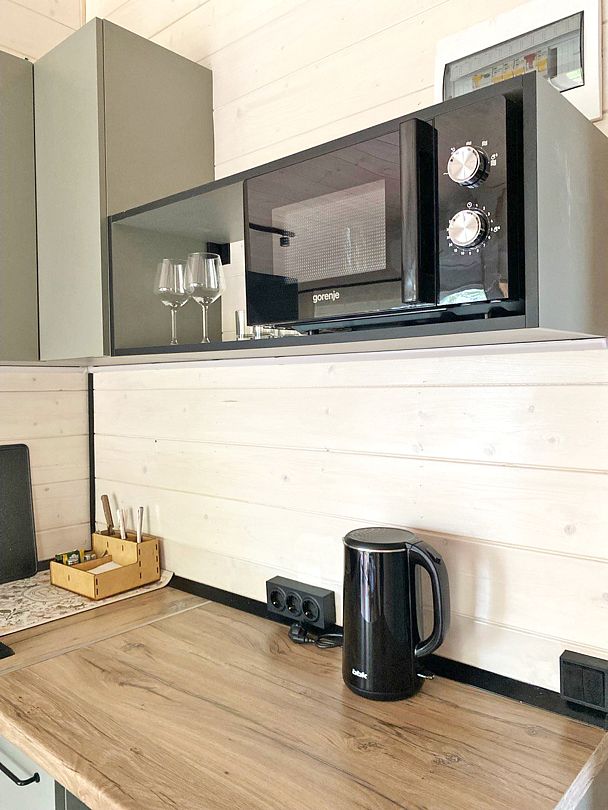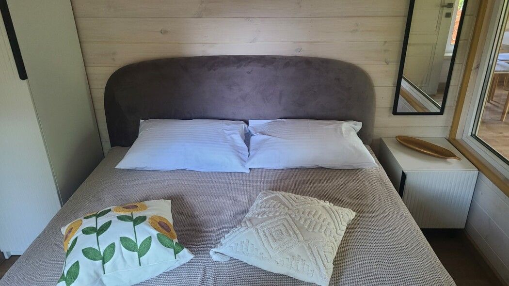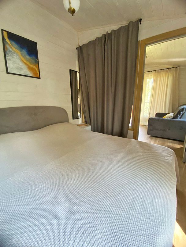 В домике двуспальная кровать, раскладной диван, телевизор, кондиционер, СВЧ, холодильник, посуда. В душевой кабине банные принадлежности, фен.