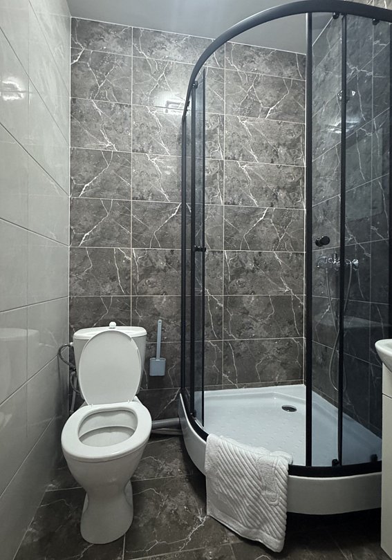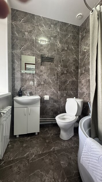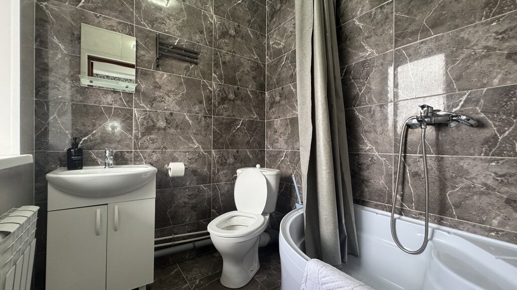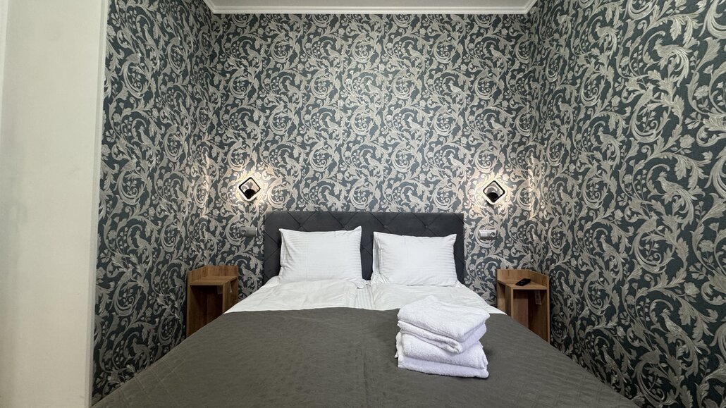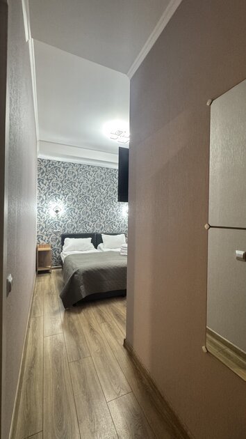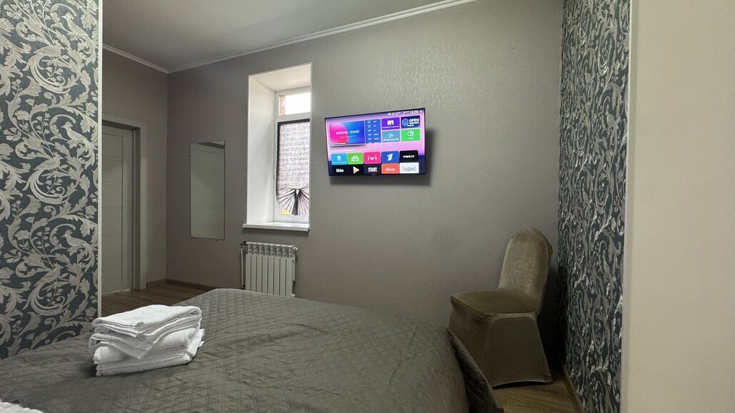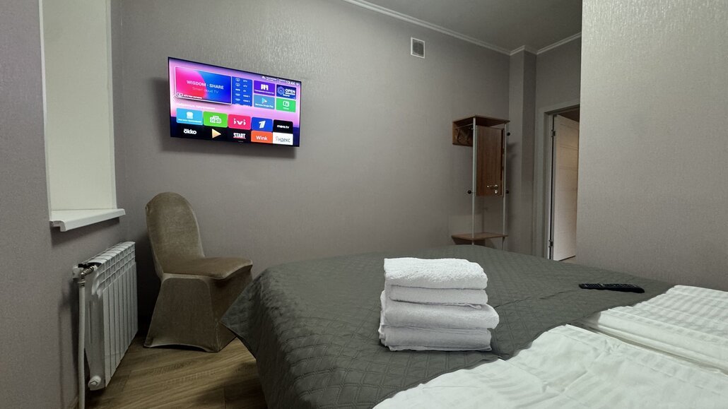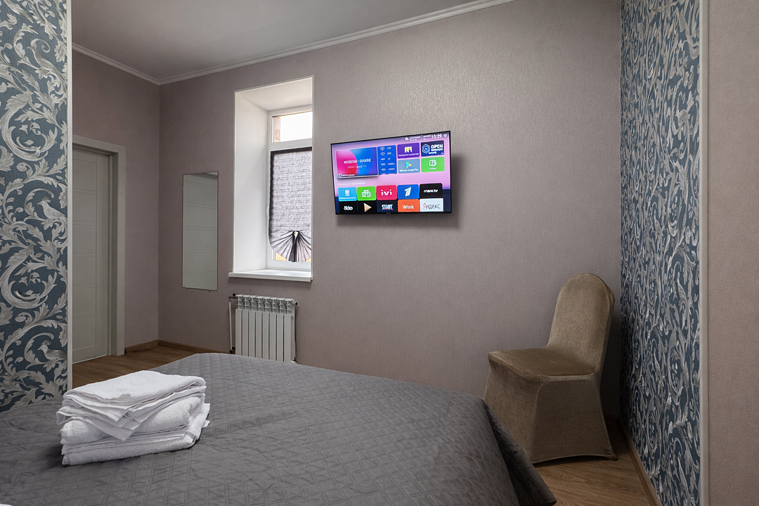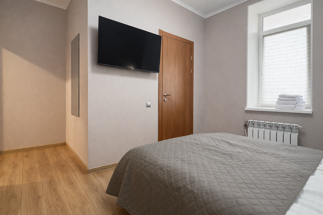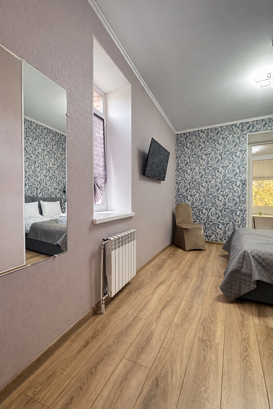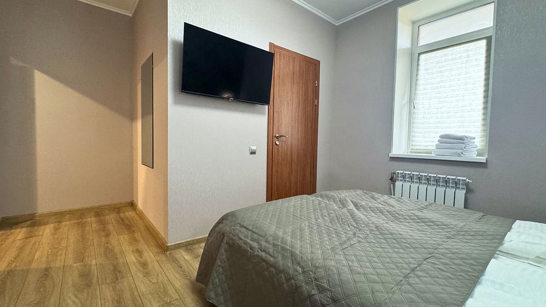 Удобства в номере: двуспальная кровать, телевизор, зеркало, мини‑холодильник, электрический чайник, небольшой набор посуды, собственный душ и туалет. Дополнительно: бесплатная стиральная машина в общем доступе, удобная парковка рядом с домом.