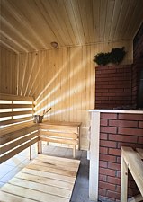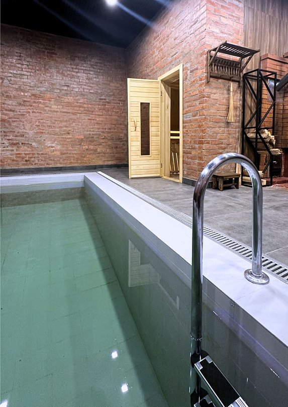 В распоряжении гостей просторная парная, бассейн и уютная зона для расслабления со столом и скамейками, а также необходимые принадлежности — полотенца, простыни и мыло для рук.