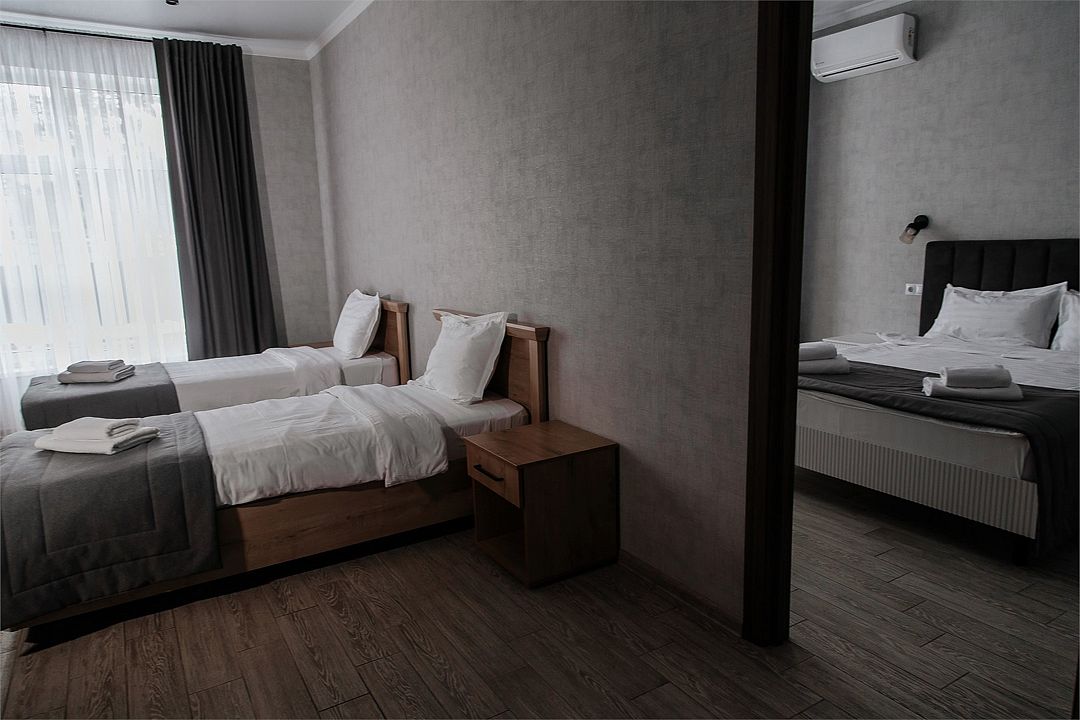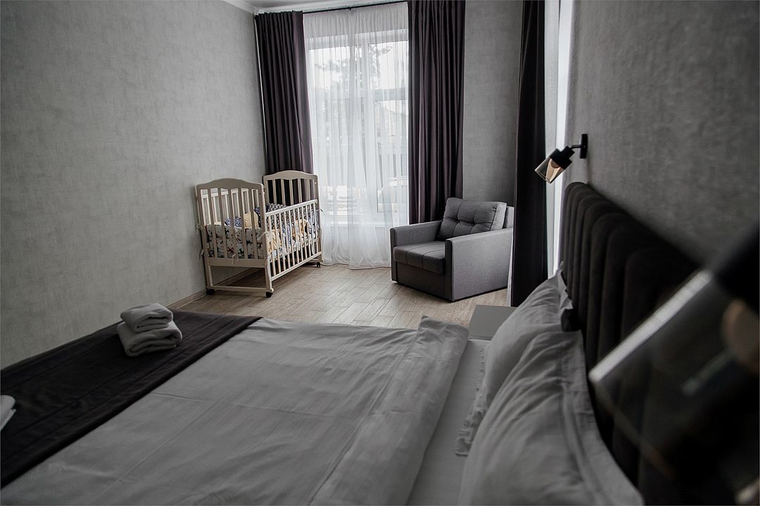 Номер категории Семейный - лучший выбор для семьи, которая предпочитает путешествовать и отдыхать вместе. Номер разделен на две спальные зоны. В одной комнате большая двухспальная кровать, кресло-кровать и детская кроватка, во второй - две односпальные кровати.Услуги и удобства