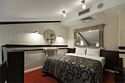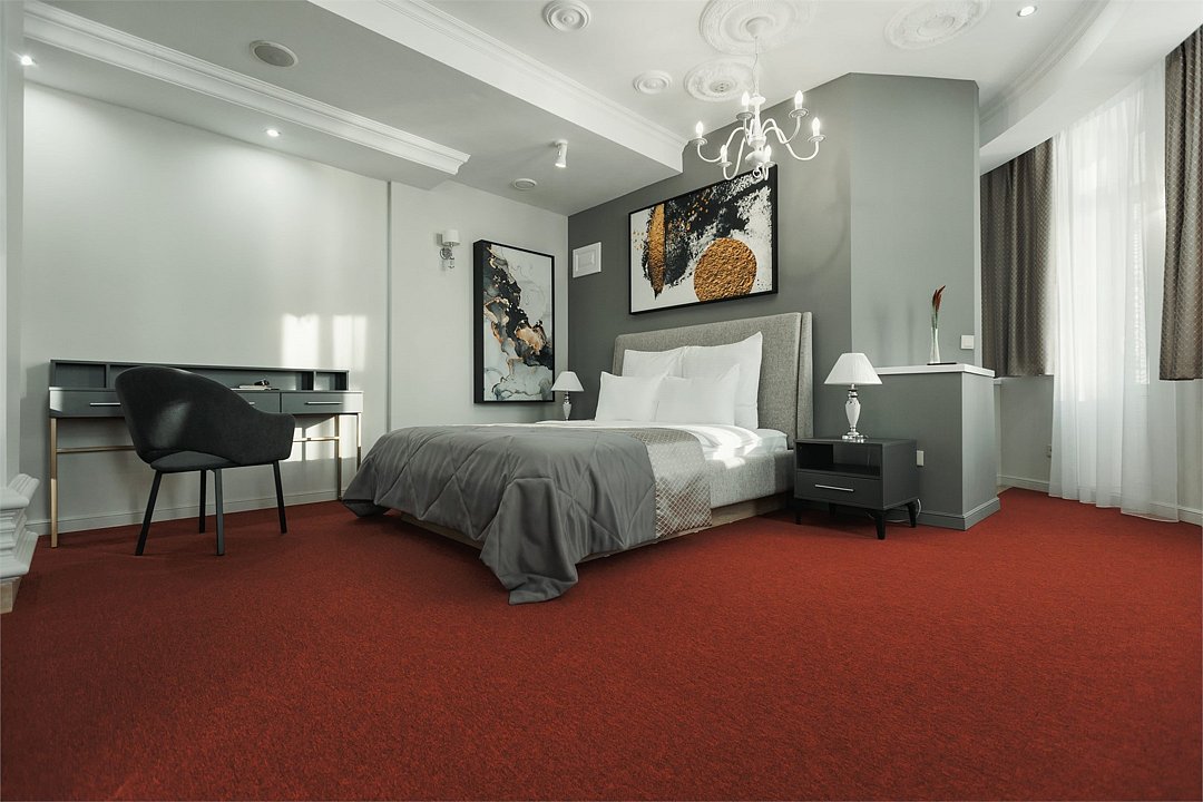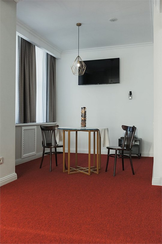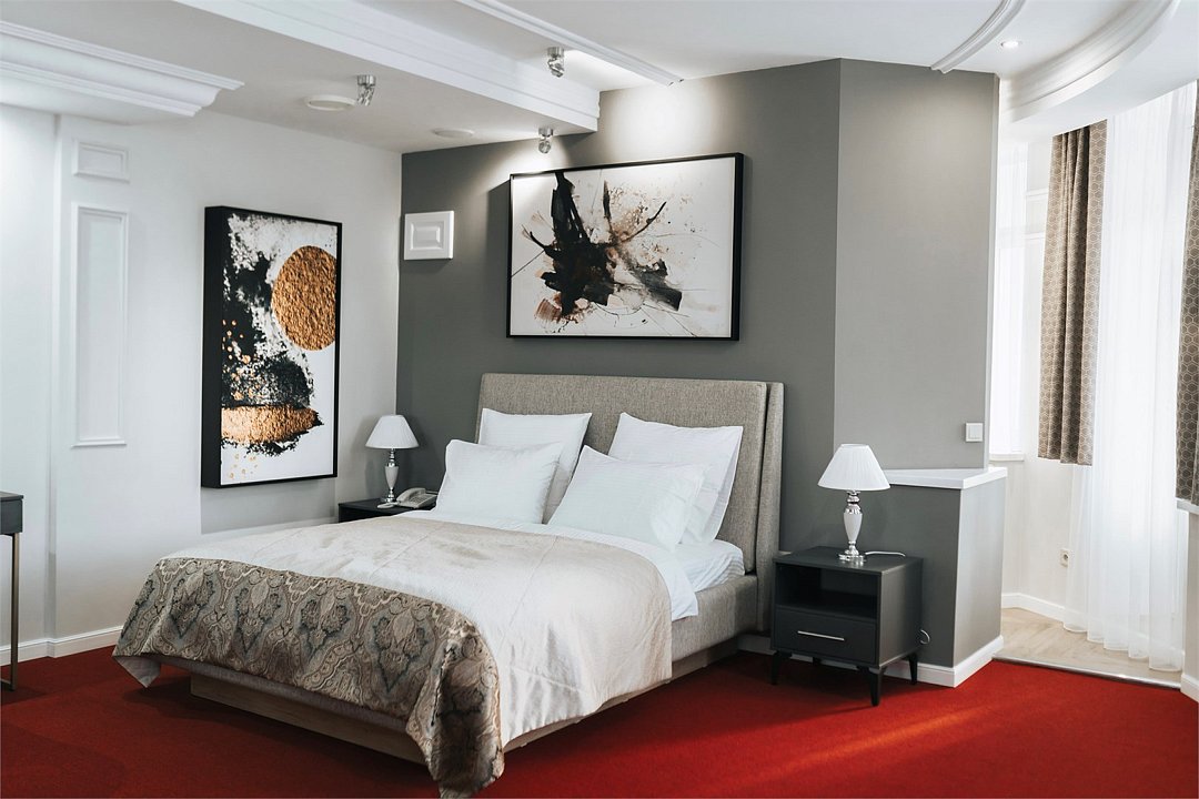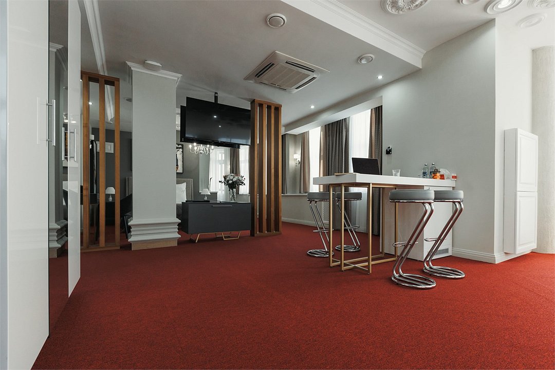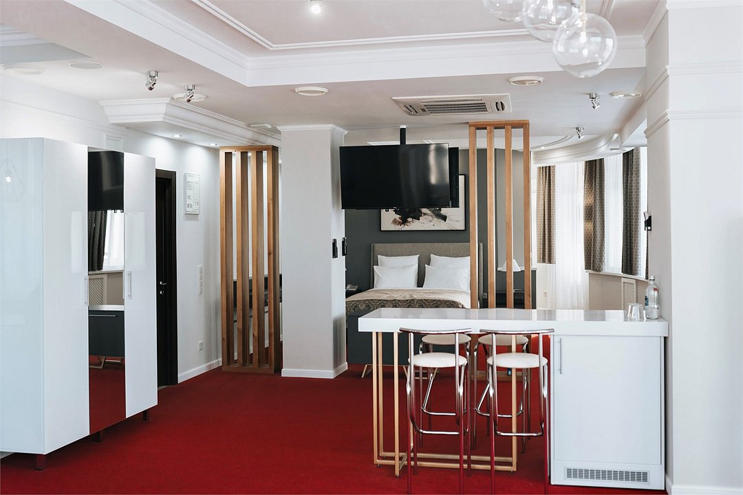 Junior Suite Deluxe – это просторный двухместный номер повышенной комфортности, площадью 26 кв.м., с кроватью «King-Size». Номер выполнен в шоколадно-золотистой гамме, что подчеркивает аристократичный и изысканный вкус гостей! Номер отлично подойдет для пар с детьми, так как имеет много свободного пространства. Для больших компаний идеальным выбором будет двухкомнатный вариант номера данной категории, площадь которого 53,5 м.кв. В нем могут разместиться до 4х человекУслуги и удобства