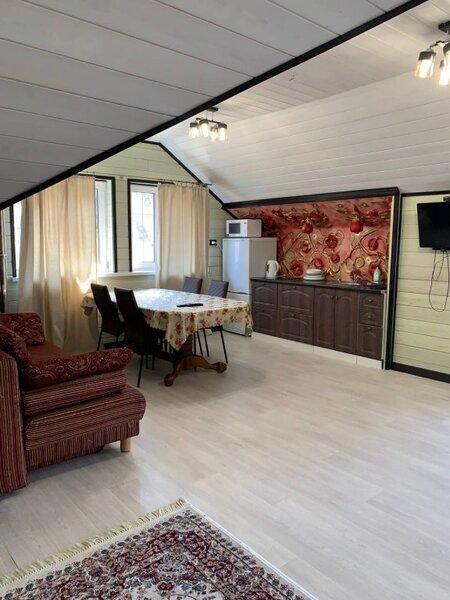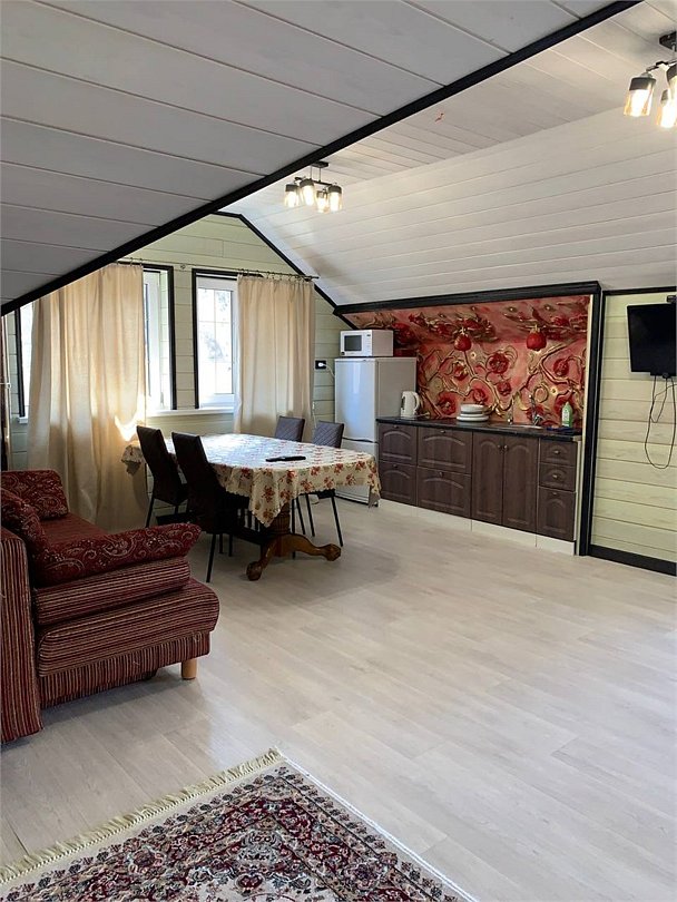 Комната 55 кв.м. В четырёхместном номере предоставляется: •одна двухспальная кровать, два двухместных диван •кухонные приборы (холодильник, чайник, микроволновка, плита, телевизор(ТВ 250каналов), посуда на 4 человека •4 комплекта постельного белья •4 полотенца •санузел в комнате •в номере есть террасаУслуги и удобства