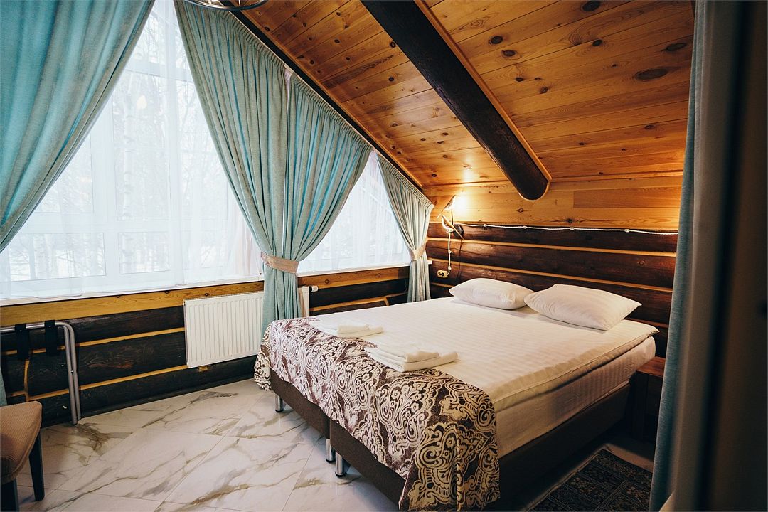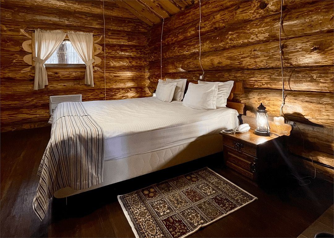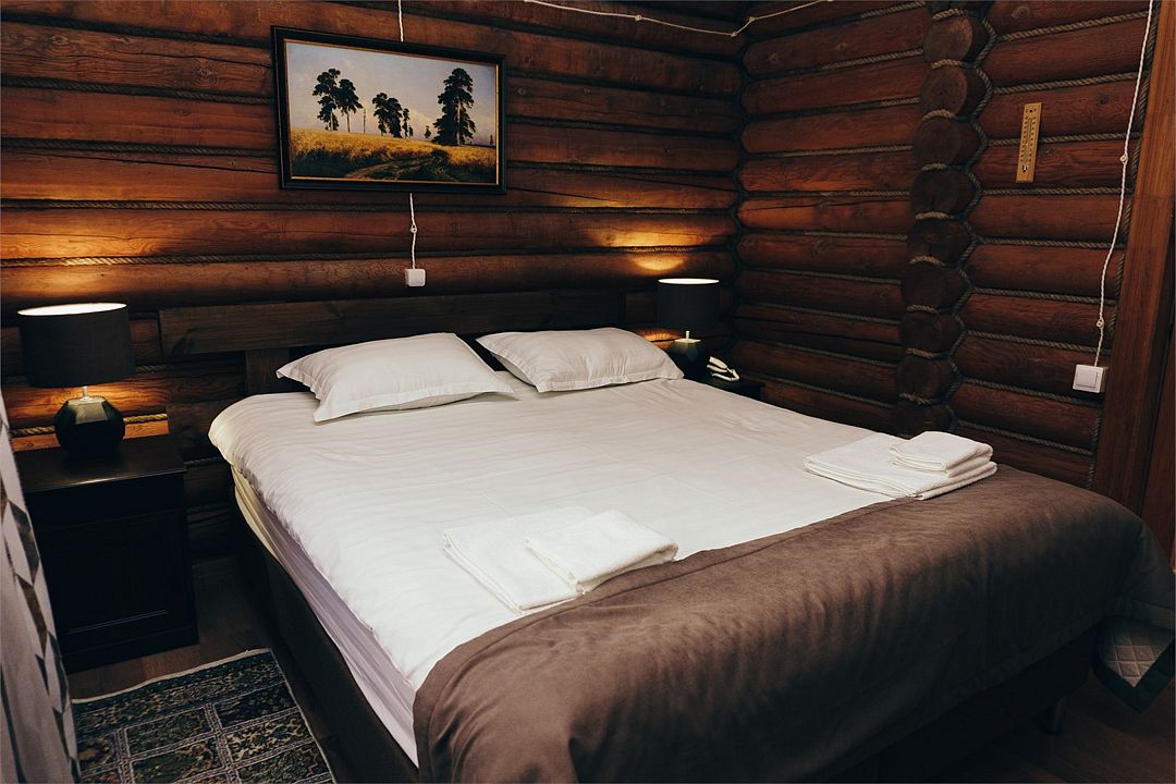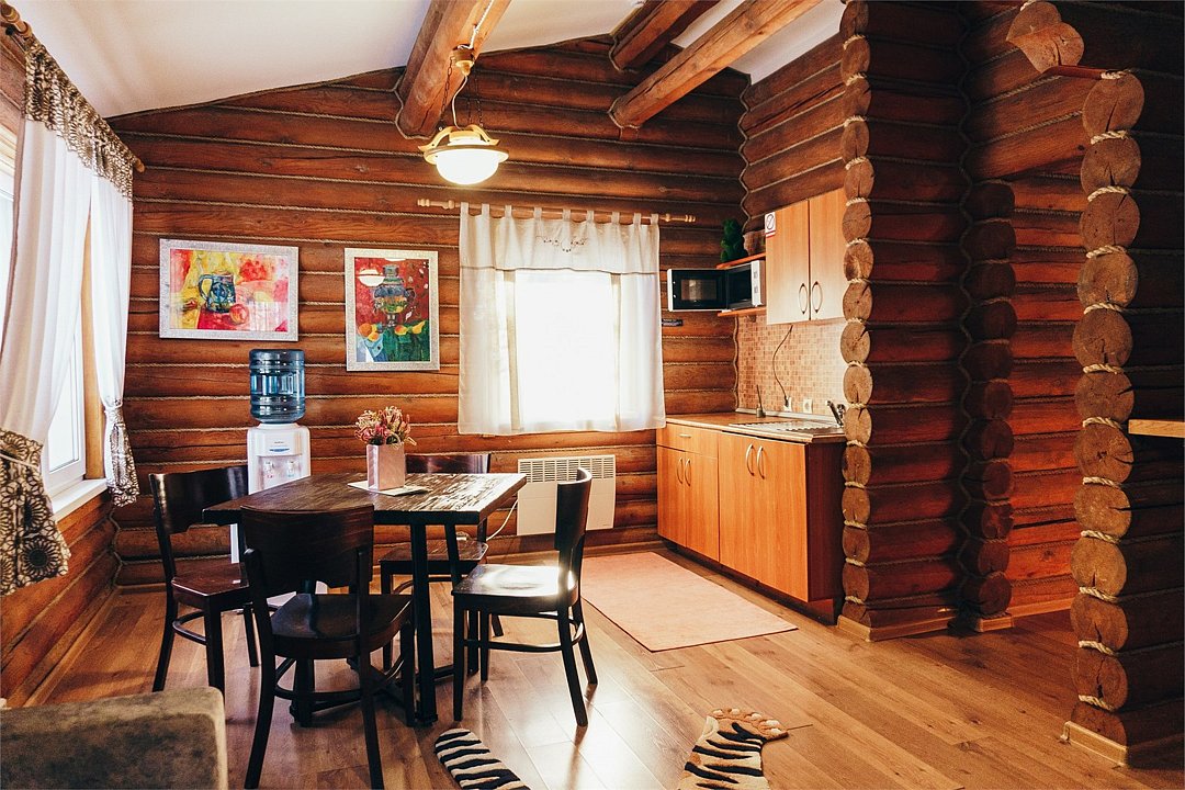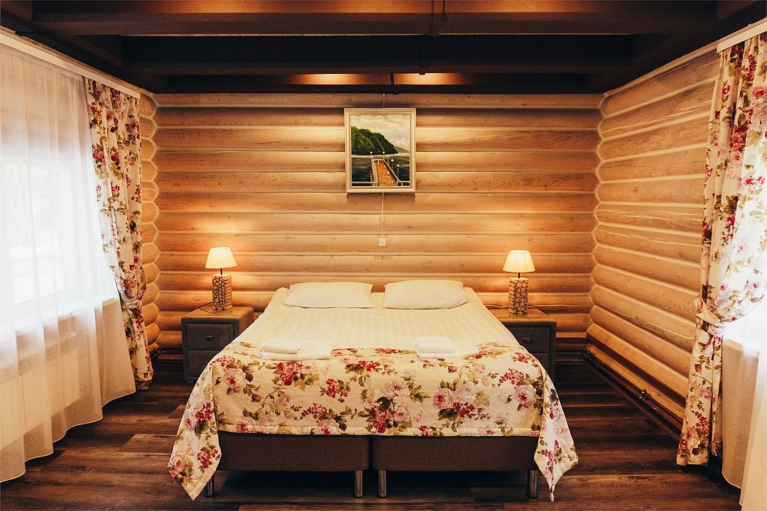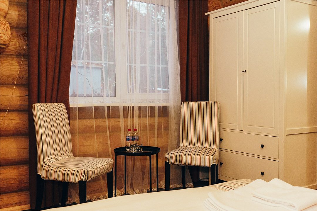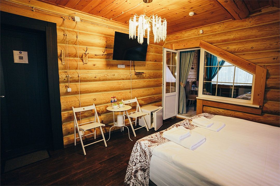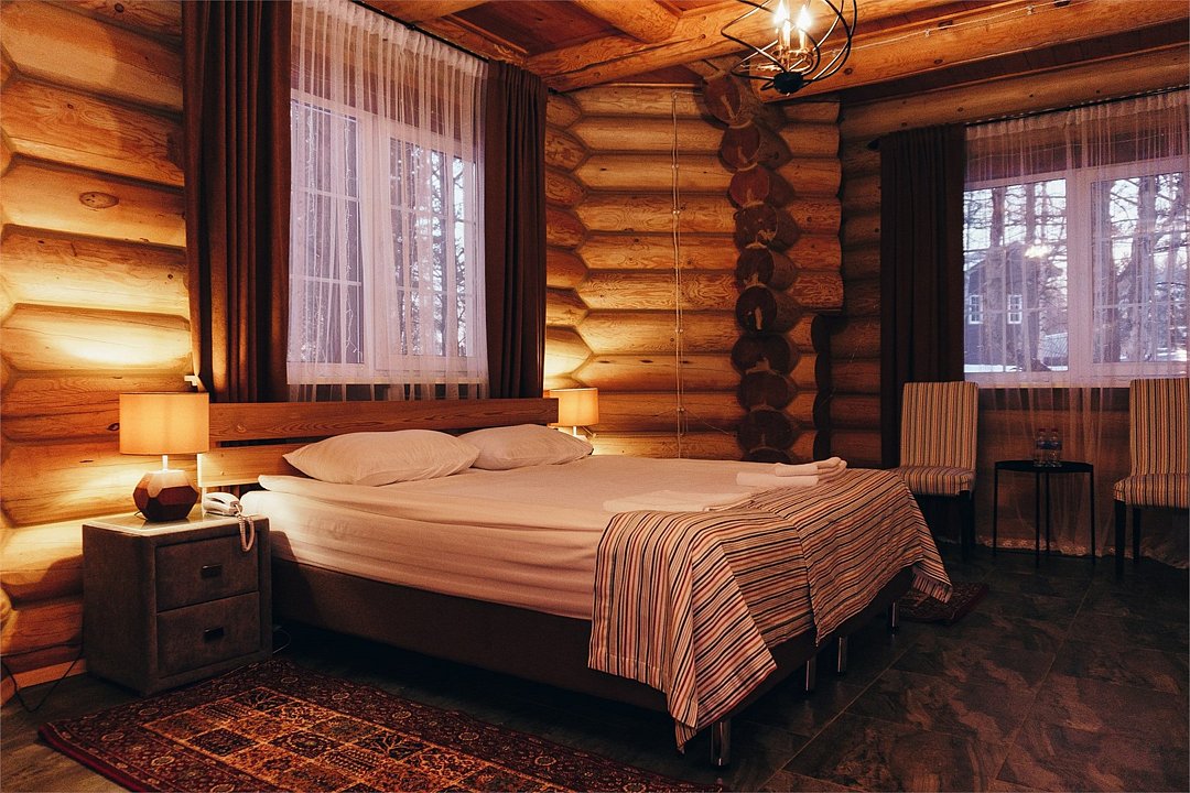 Весь номерной фонд выполнен из сибирской сосны в традициях русского деревянного дома. Гости могут разместиться как в стандартных номерах, так и арендовать коттедж.