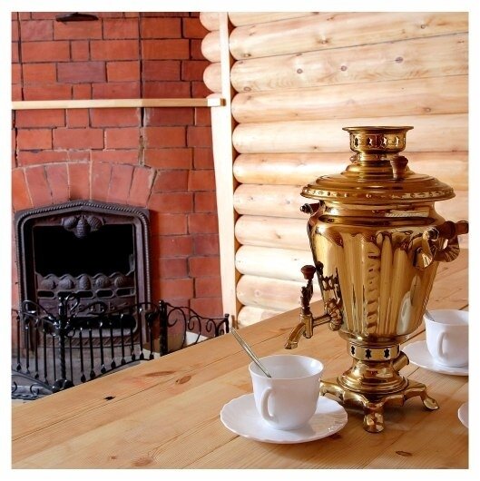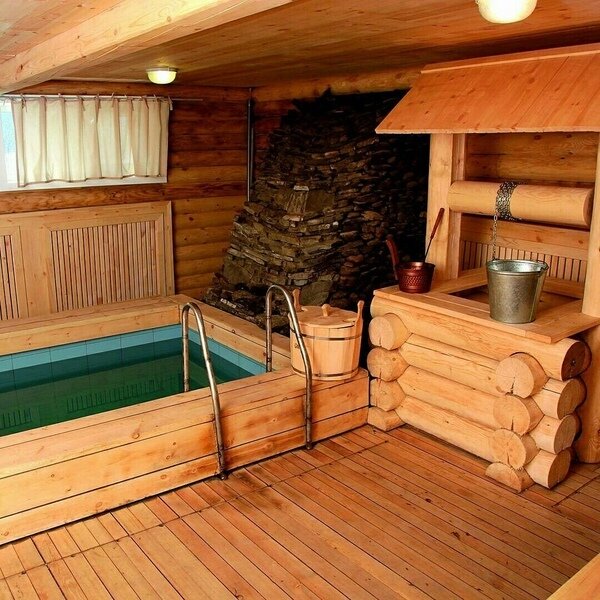 Настоящая русская топка на дровах, парная из сосны, бассейн со студеной водой, комната отдыха с большим обеденным столом и камином.