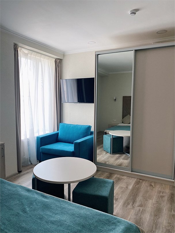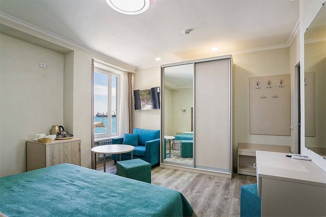 Однокомнатный, 2-х местный стандартный номер с видом на море. Балкон с мебелью для отдыха.Дополнительное место-раскладушка.Услуги и удобства